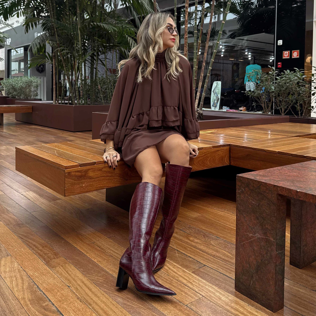 Adicione um toque de sofisticação com a bota Mabel de cano alto, perfeita para quem gosta de um design moderno e sofisticado. O bico fino adiciona um toque de elegância ao design, enquanto o salto grosso na altura de 9cm proporciona conforto e segurança ao caminhar. O fechamento lateral em zíper garante praticidade e um calce rápido.