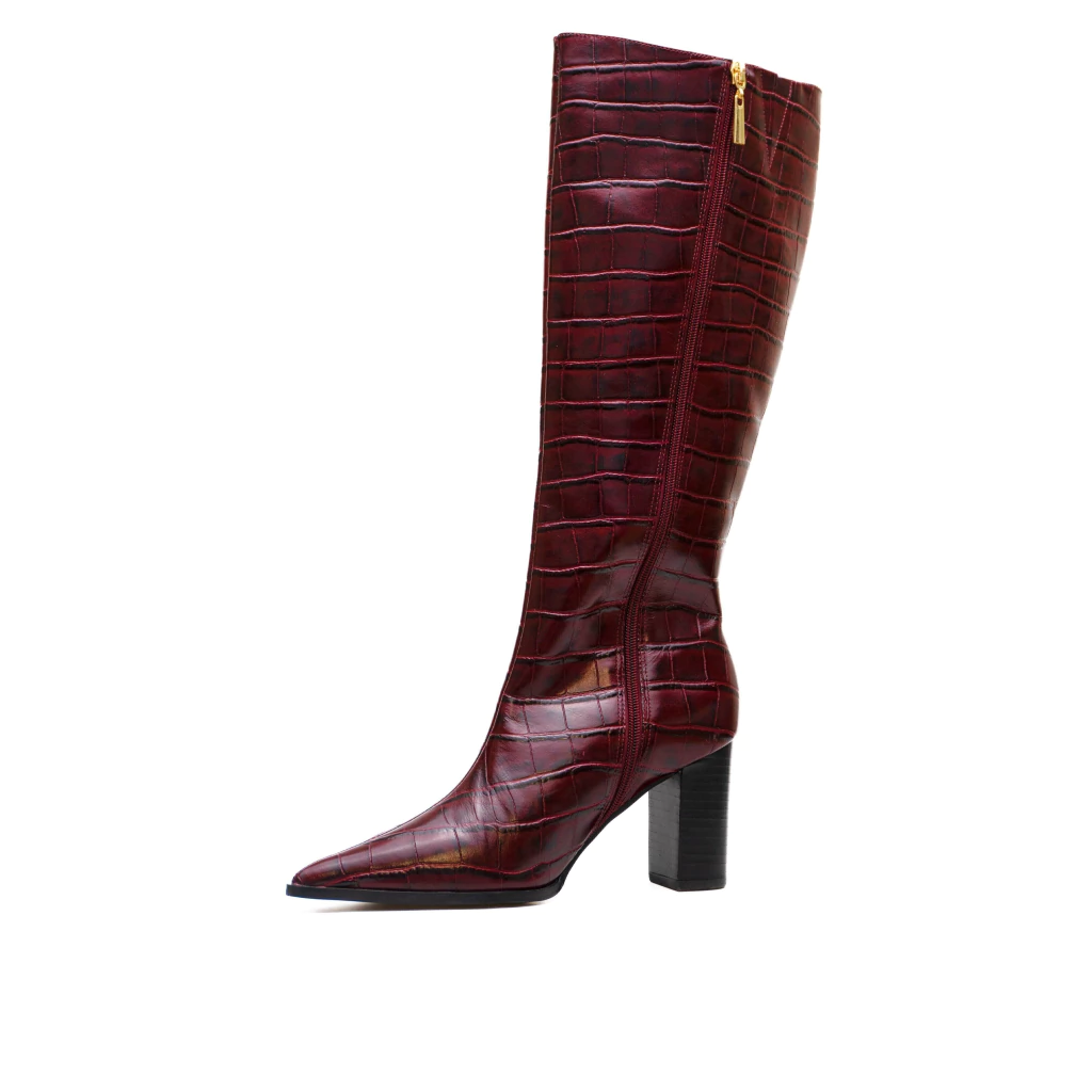 A cor desse modelo é um tom de bordô/vinho em material croco couro.