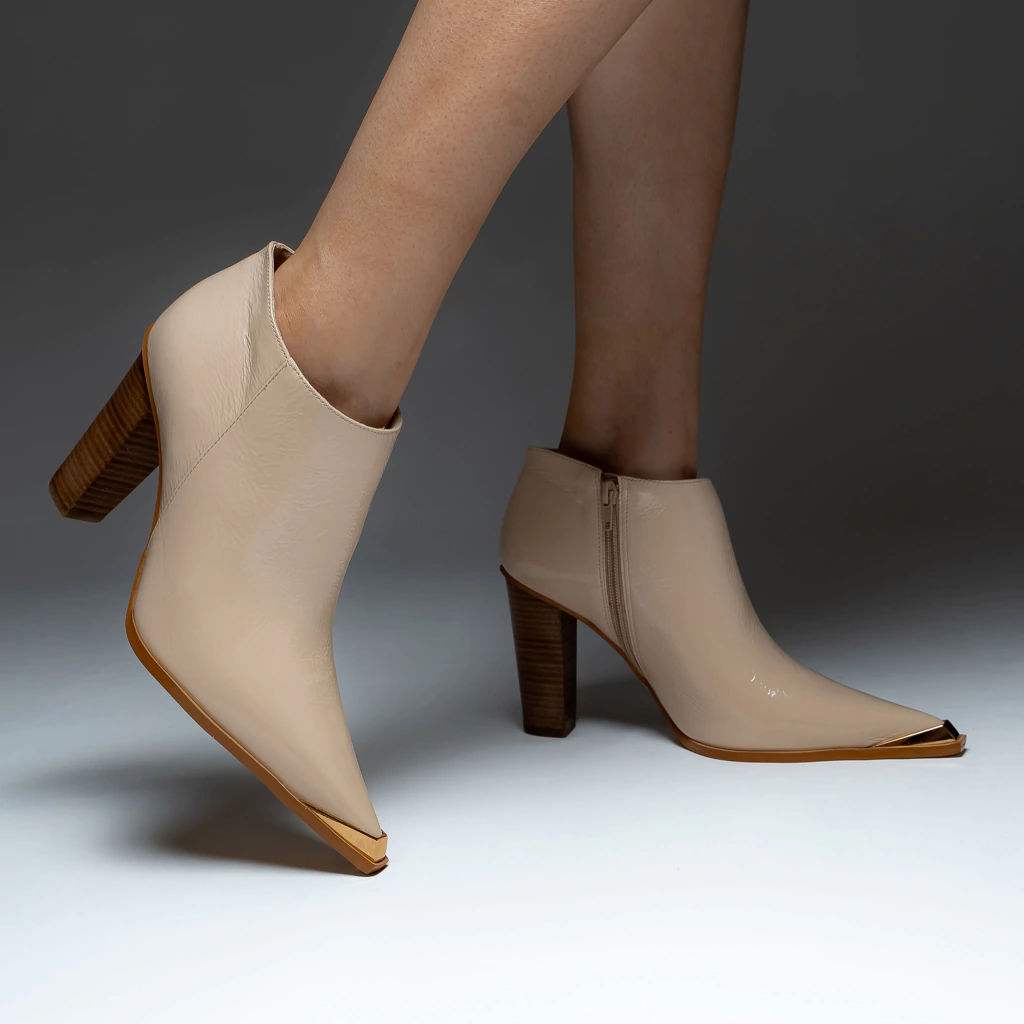 A bota cano baixo Pâmela é moderna e sofisticada, perfeita para compor looks elegantes em diversas ocasiões. Possui design minimalista e atemporal. O bico fino com detalhe metálico dourado adiciona um toque de sofisticação ao visual, enquanto o salto grosso na altura de 9,5cm proporciona conforto e estabilidade para o uso diário. O fechamento lateral em zíper garante praticidade e um calce rápido.