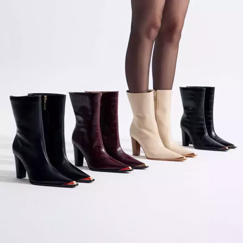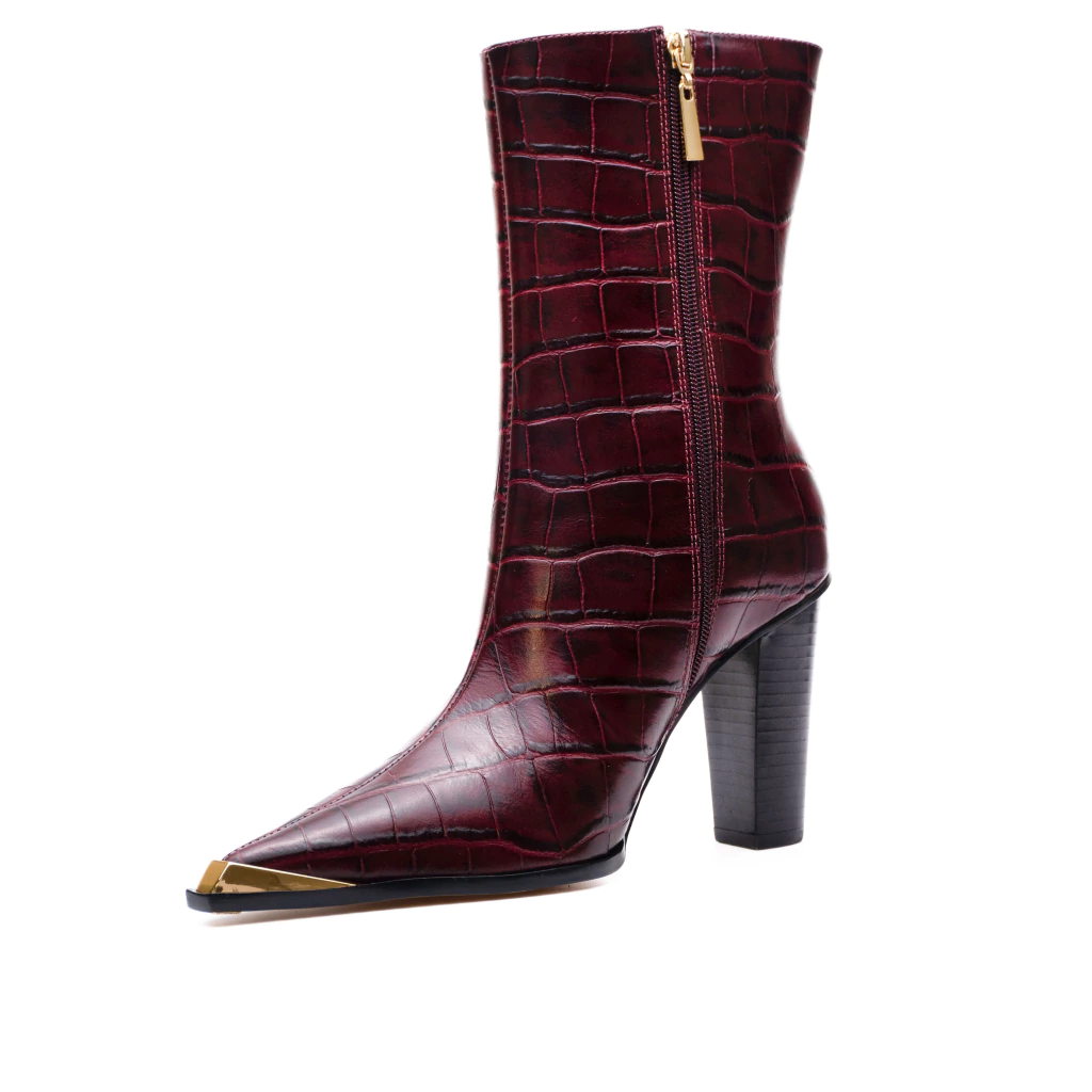 Adicione um toque de sofisticação com a bota Valena de cano médio, perfeita para quem gosta de um design moderno e elegante. O bico fino conta com um detalhe metálico dourado que traz refinamento à peça, enquanto o salto grosso na altura de 9,5cm proporciona conforto e estabilidade ao caminhar. Possui fechamento em zíper lateral, garantindo um calce fácil e prático.