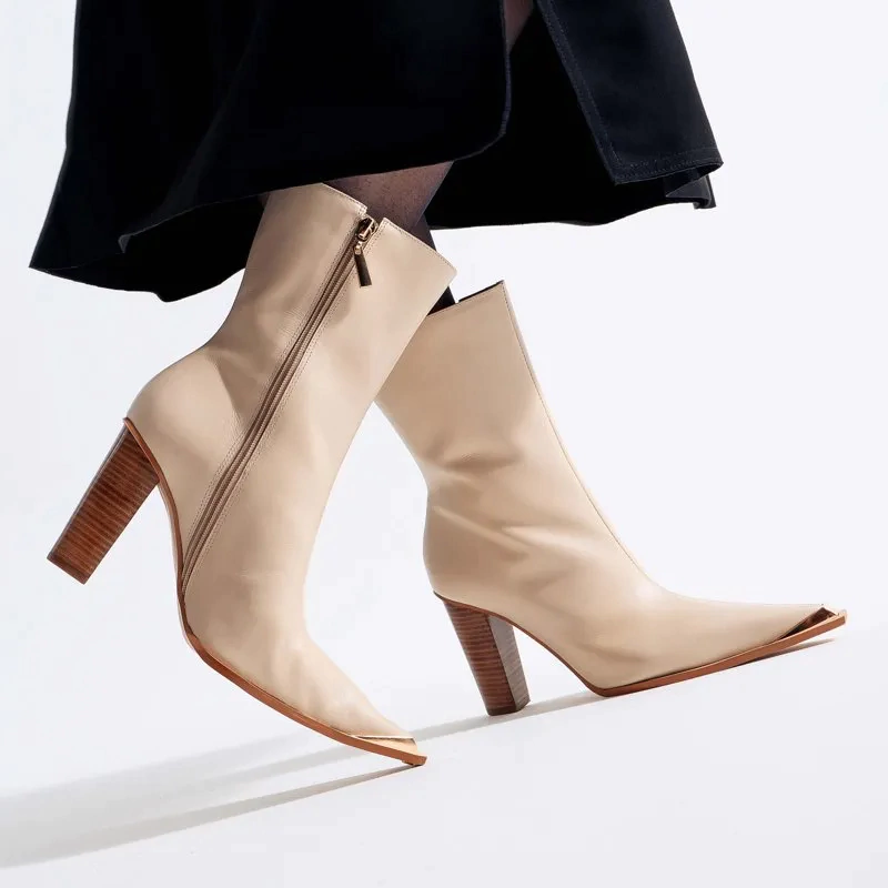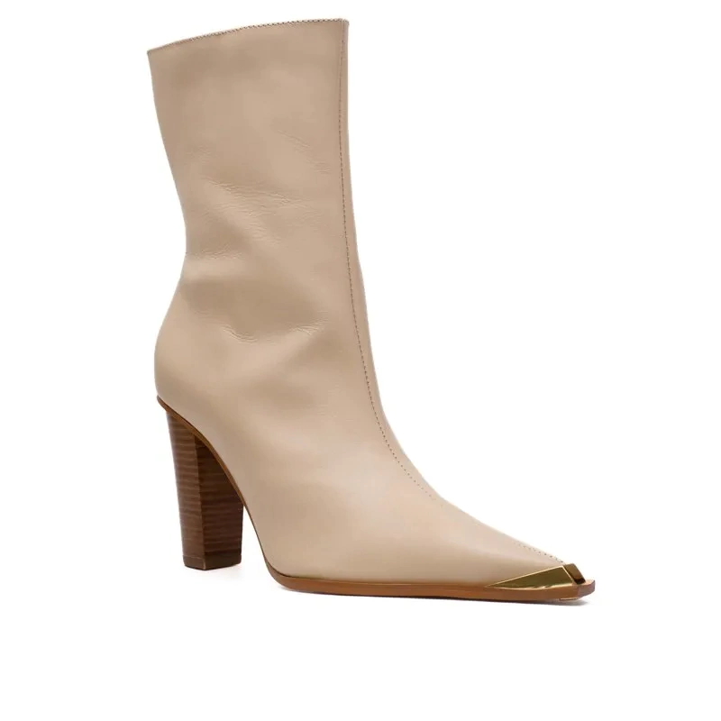 Adicione um toque de sofisticação com a bota Valena de cano médio, perfeita para quem gosta de um design moderno e elegante. O bico fino conta com um detalhe metálico dourado que traz refinamento à peça, enquanto o salto grosso na altura de 9,5cm proporciona conforto e estabilidade ao caminhar. Possui fechamento em zíper lateral, garantindo um calce fácil e prático.