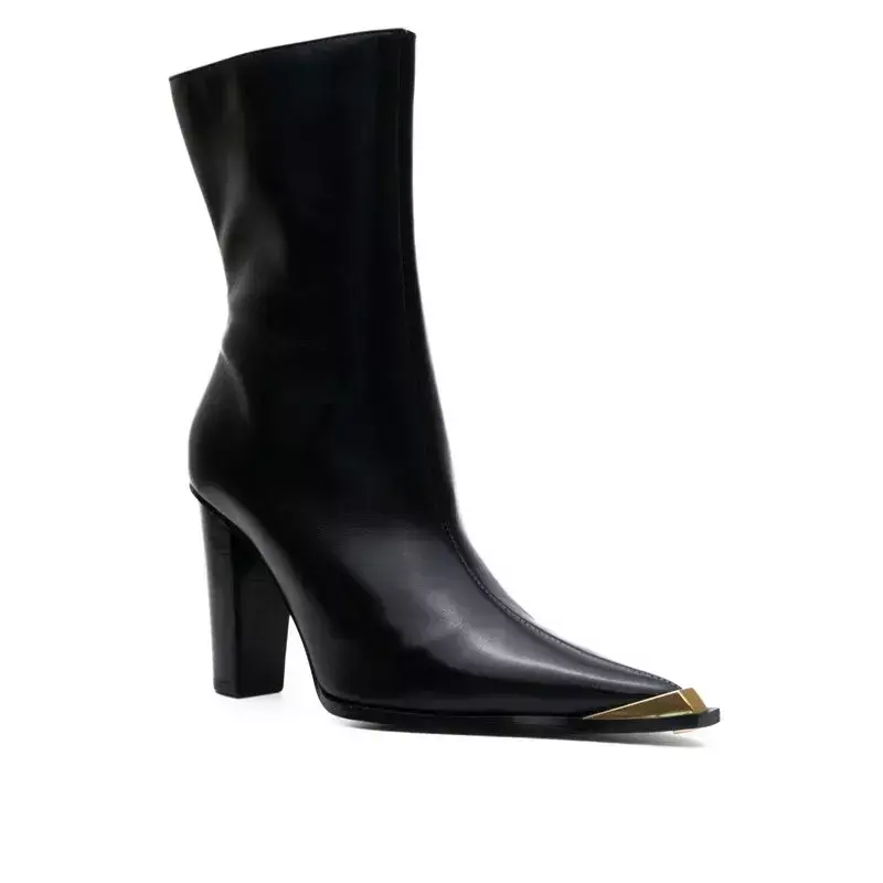 Adicione um toque de sofisticação com a bota Valena de cano médio, perfeita para quem gosta de um design moderno e elegante. O bico fino conta com um detalhe metálico dourado que traz refinamento à peça, enquanto o salto grosso na altura de 9,5cm proporciona conforto e estabilidade ao caminhar. Possui fechamento em zíper lateral, garantindo um calce fácil e prático.
