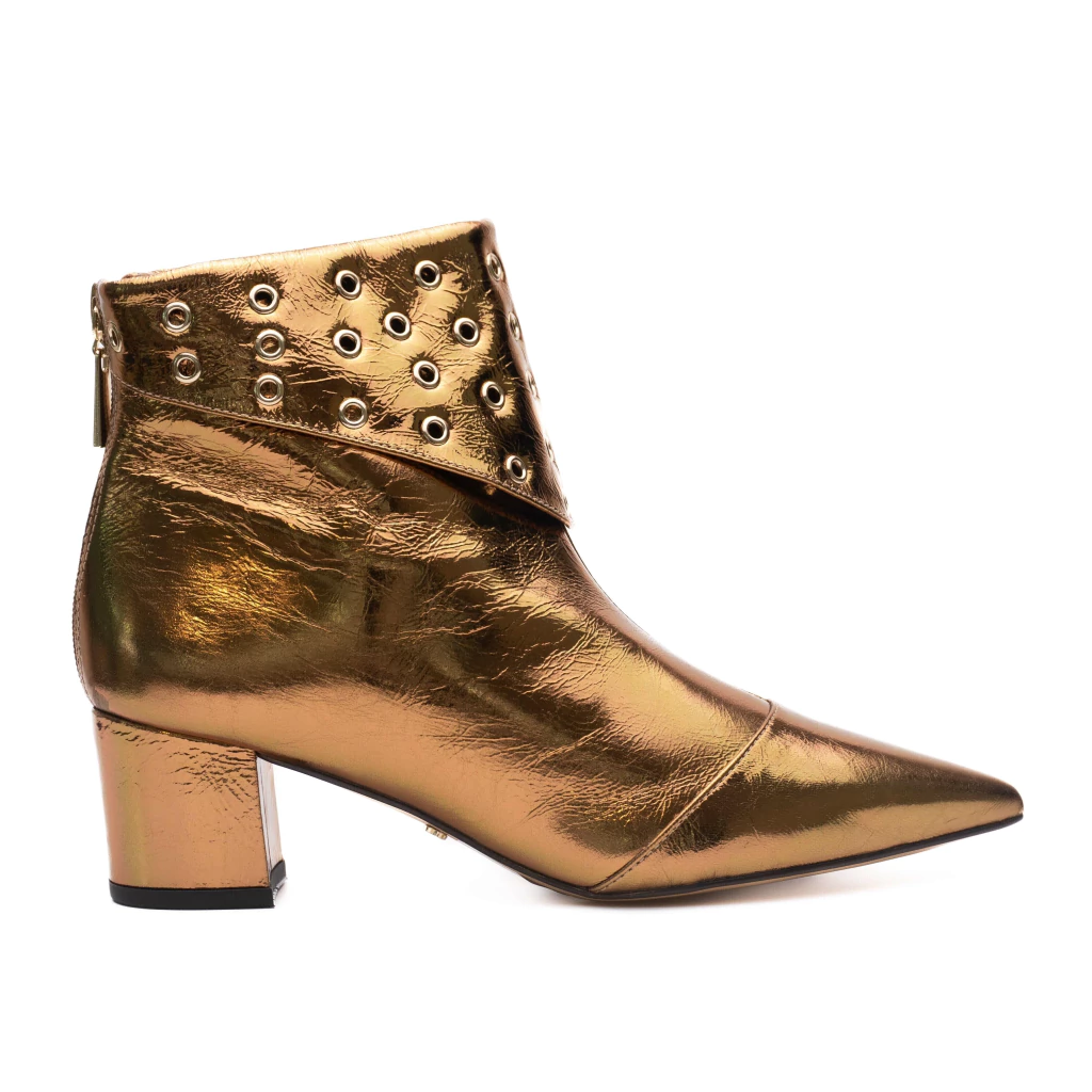 A bota Pietra possui design sofisticado e detalhes em ilhós na parte superior, conferindo um toque moderno e elegante. O modelo possui bico fino, que alonga a silhueta, e salto baixo na altura de 5,5cm, garantindo conforto sem perder a sofisticação. Fechamento em zíper traseiro para praticidade ao calçar.