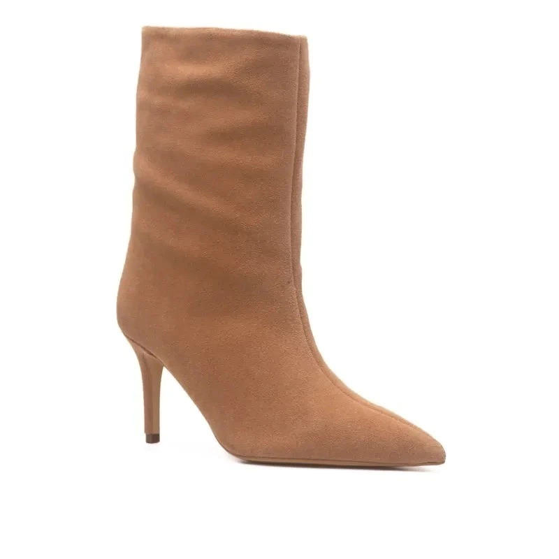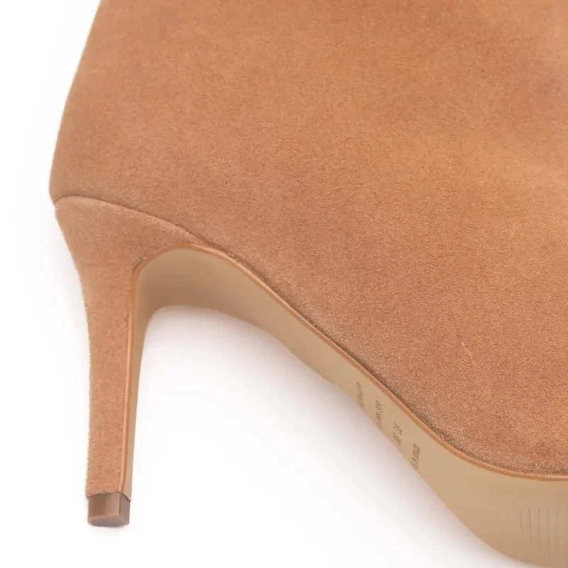 A cor desse modelo é um tom de marrom caramelo em material de camurça couro.