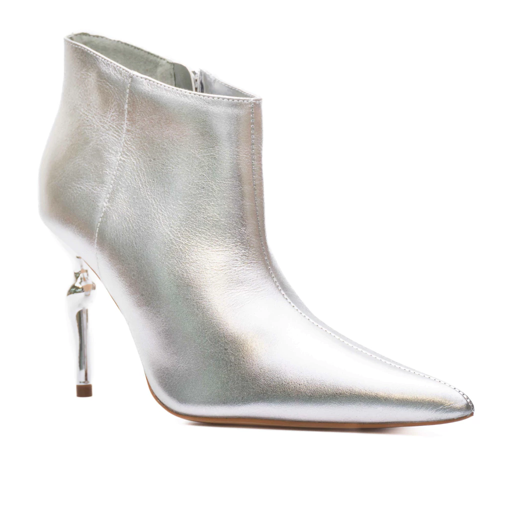 A cor desse modelo é um tom de prata em material couro metalizado.