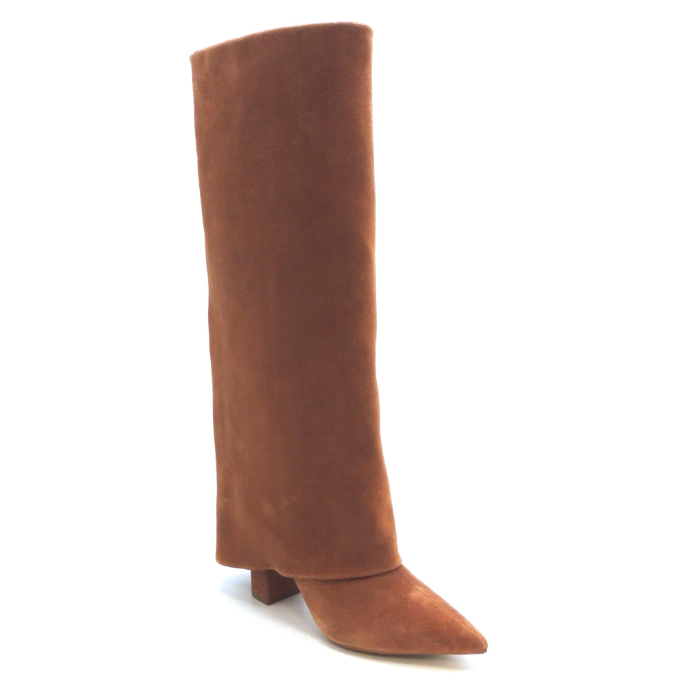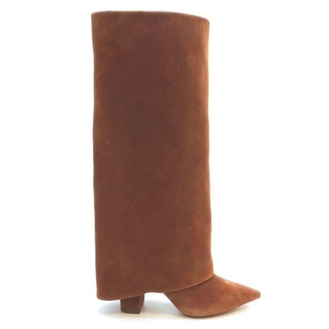 A cor desse modelo é um tom de marrom caramelo em material de camurça couro.