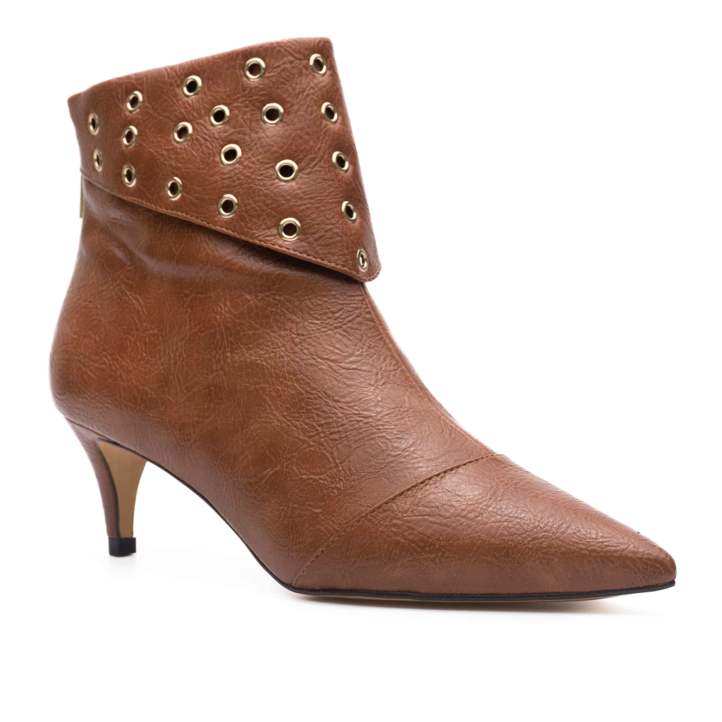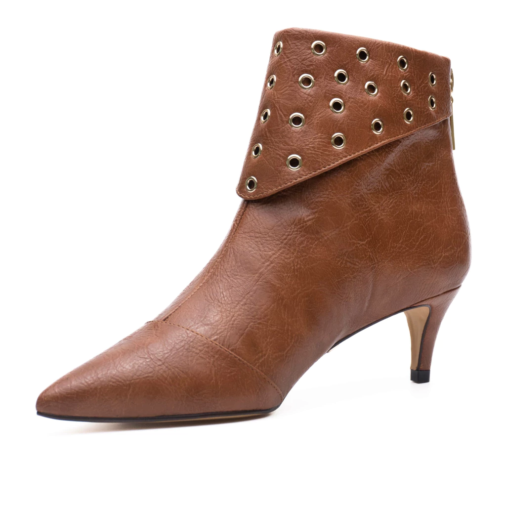 A bota Pietra possui design sofisticado e detalhes em ilhós na parte superior, conferindo um toque moderno e elegante. O modelo possui bico fino, que alonga a silhueta, e salto baixo na altura de 5,5cm, garantindo conforto sem perder a sofisticação. Fechamento em zíper traseiro para praticidade ao calçar.