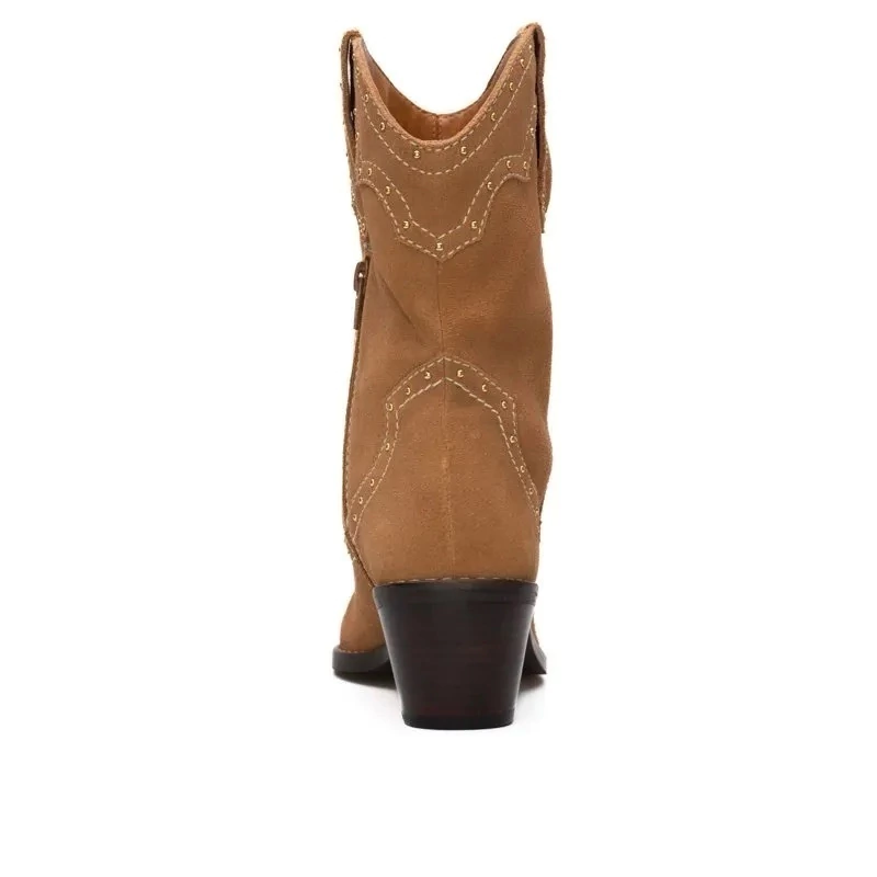 A cor desse modelo é um tom de marrom caramelo em material de camurça couro.