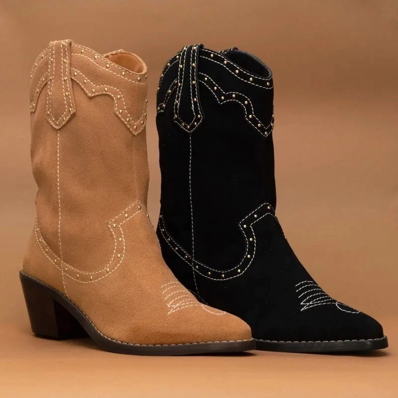A bota Morinna em couro combina elegância e atitude em um design sofisticado. Com detalhes bordados contrastantes e aplicações metálicas, ela traz um toque moderno ao clássico western. Seu salto médio na altura de 5cm garante conforto e versatilidade para diversas ocasiões, enquanto o bico levemente fino adiciona um ar refinado. Perfeita para composições fashionistas, essa bota é um must-have para quem deseja um visual autêntico e cheio de personalidade.
