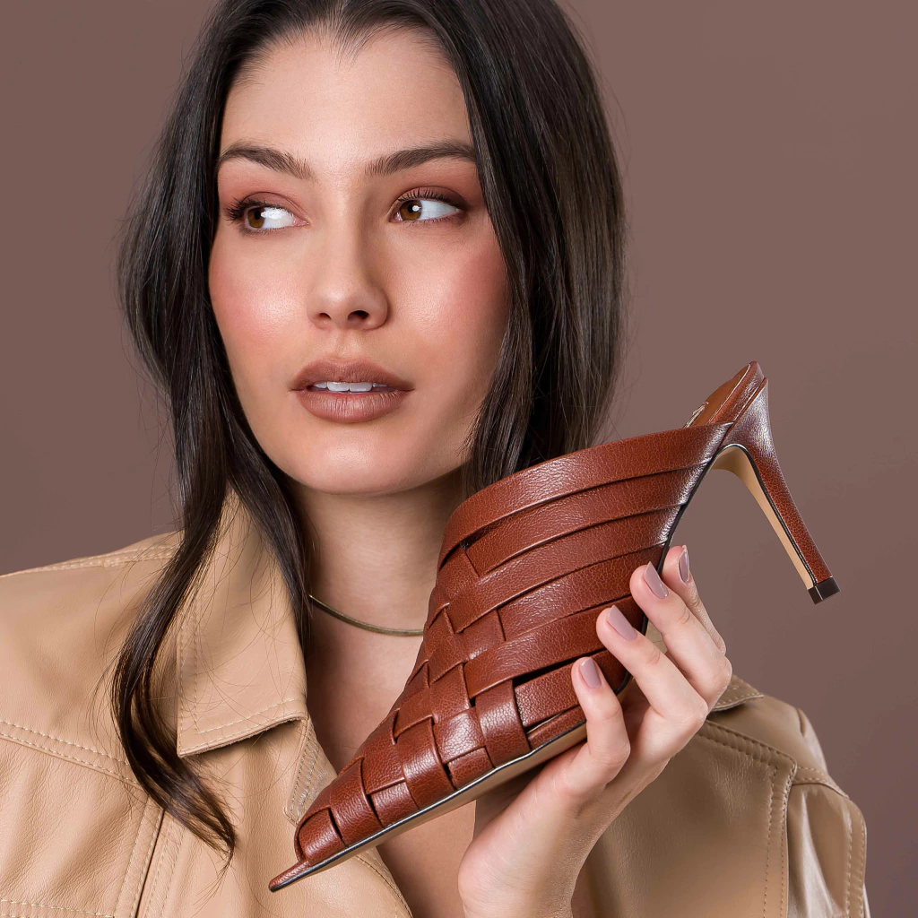 A mule Gaia de salto médio de 8cm, combina sofisticação e conforto em um design moderno e atemporal. O cabedal apresenta um elegante trançado artesanal, que adiciona um toque de estilo e textura ao modelo. O salto fino proporciona uma silhueta sofisticada, enquanto o bico levemente alongado traz elegância à peça.