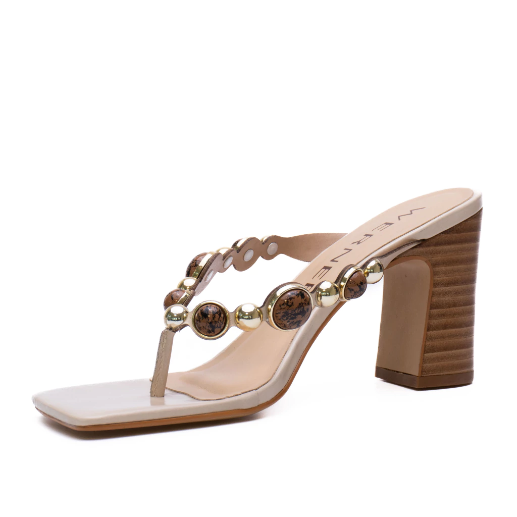 A cor desse modelo é um tom de off white em material napa couro com textura suave e toque macio com palmilha em couro. Pedras na cor marrom e dourada.