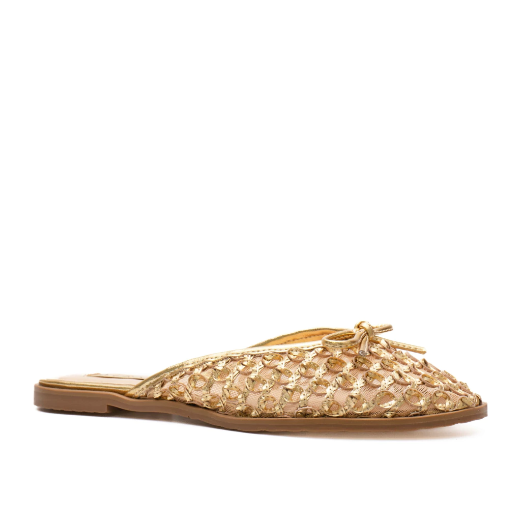 A cor desse modelo é um tom de dourado em material tramado e metalizado.