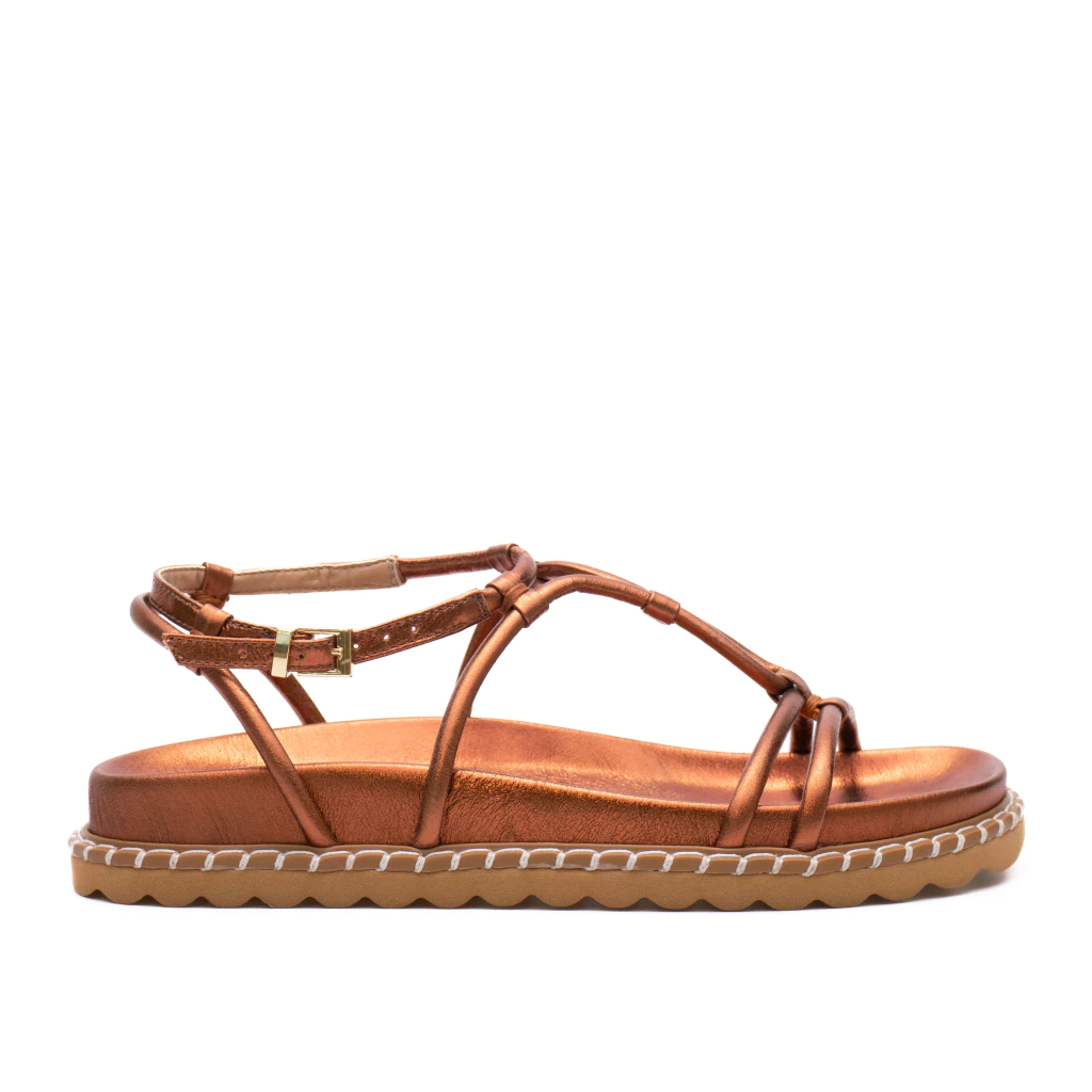 A Papete com estilo casual, perfeita para o dia a dia. Ela possui tiras finas e delicadas, oferecendo um visual leve e elegante. Apresenta tiras em seu cabedal e fivela dourada, permitindo um ajuste confortável no tornozelo. A sola é levemente elevada, com um acabamento em borracha e costuras aparentes ao redor, que adicionam um toque moderno e robusto.
