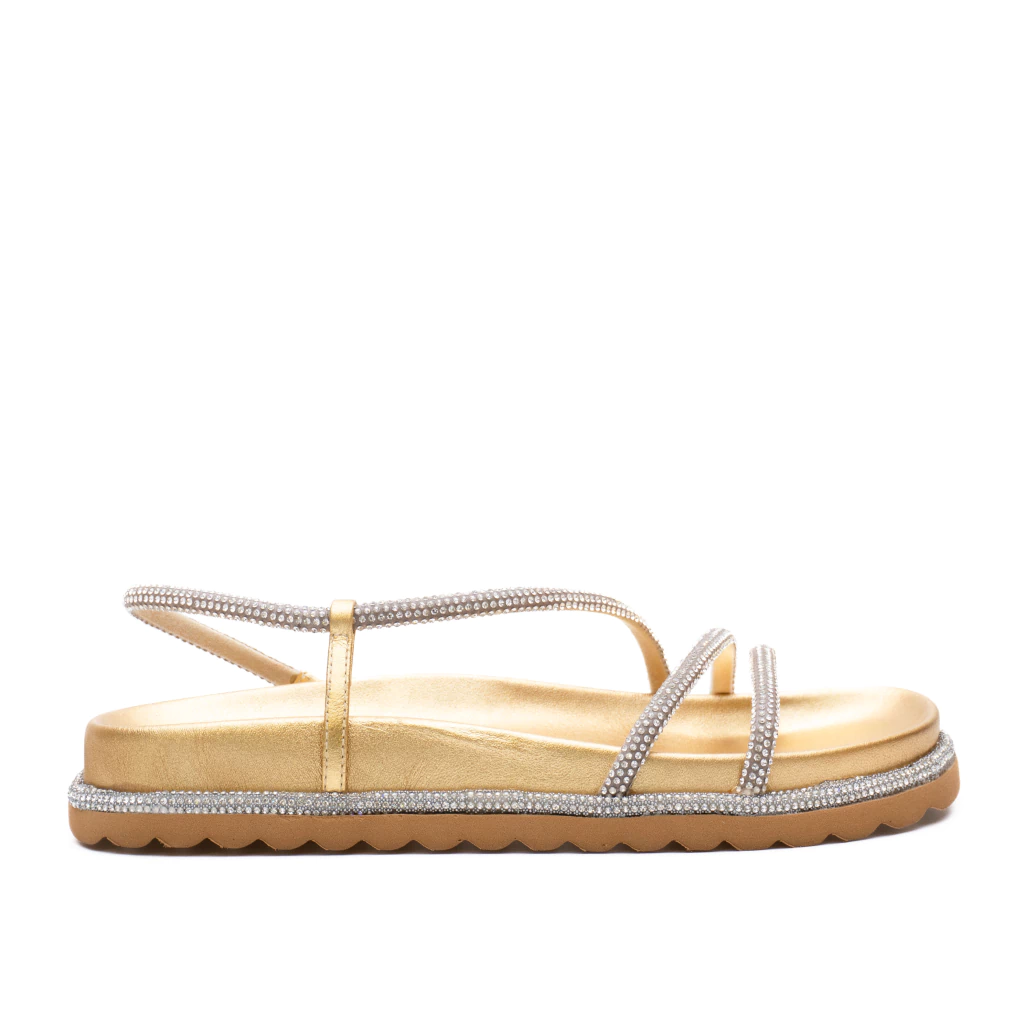 A Papete Couro Dourado Danny Werner tem altura de 2cm e bico redondo. Sua palmilha apresenta formato anatômico e traz três tiras brilhantes sobre o pé com regulagem de elástico na parte interna do pé.