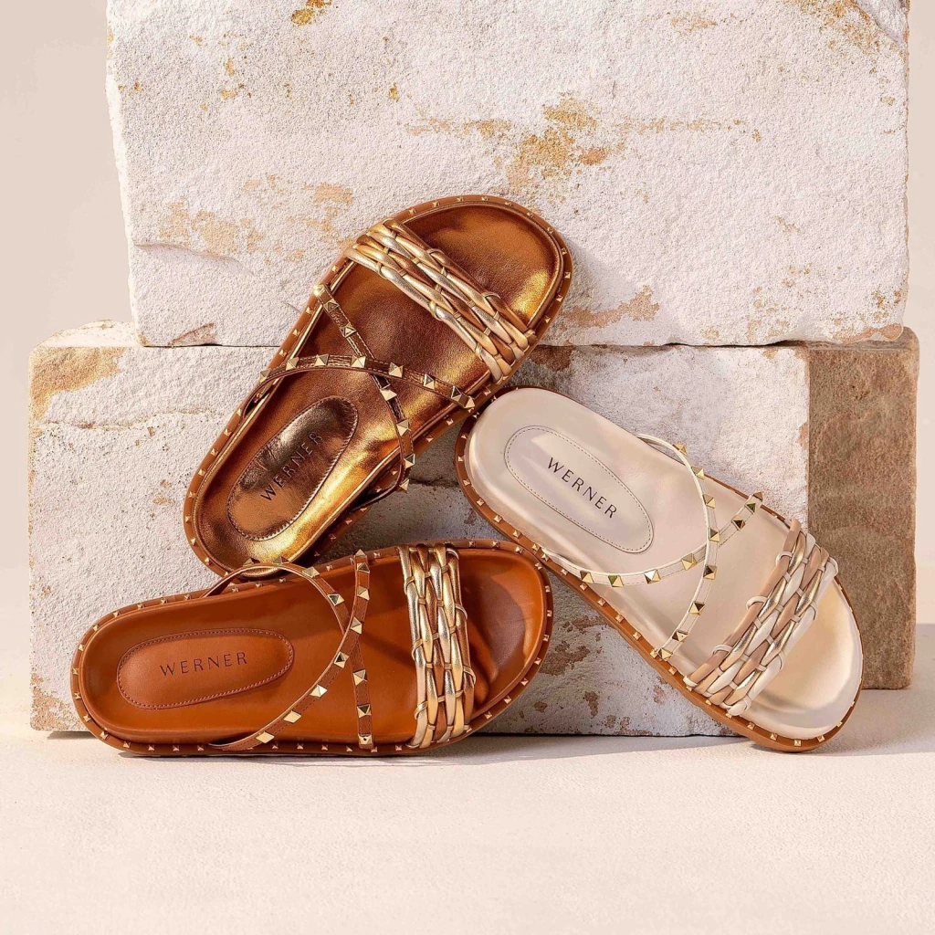 A Papete Marrom Blair Werner tem altura de 2cm e bico redondo. Sua palmilha apresenta formato anatômico e traz cabedal composto por múltiplas tiras, unidas por uma tira larga sobre os dedos. Duas tiras transversais complementam o peito do pé com aplicação de pirâmides douradas. Possui traseiro totalmente aberto.