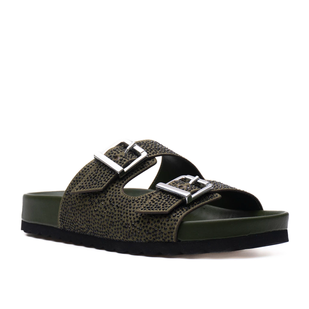 A papete Leona é ideal para quem busca o mix perfeito entre conforto e sofisticação. Conta com duas tiras largas revestidas em material camurçado e adornadas com pedrarias delicadas. As fivelas metálicas ajustáveis permitem um encaixe perfeito nos pés, enquanto a sola anatômica garante máximo conforto para o dia a dia.