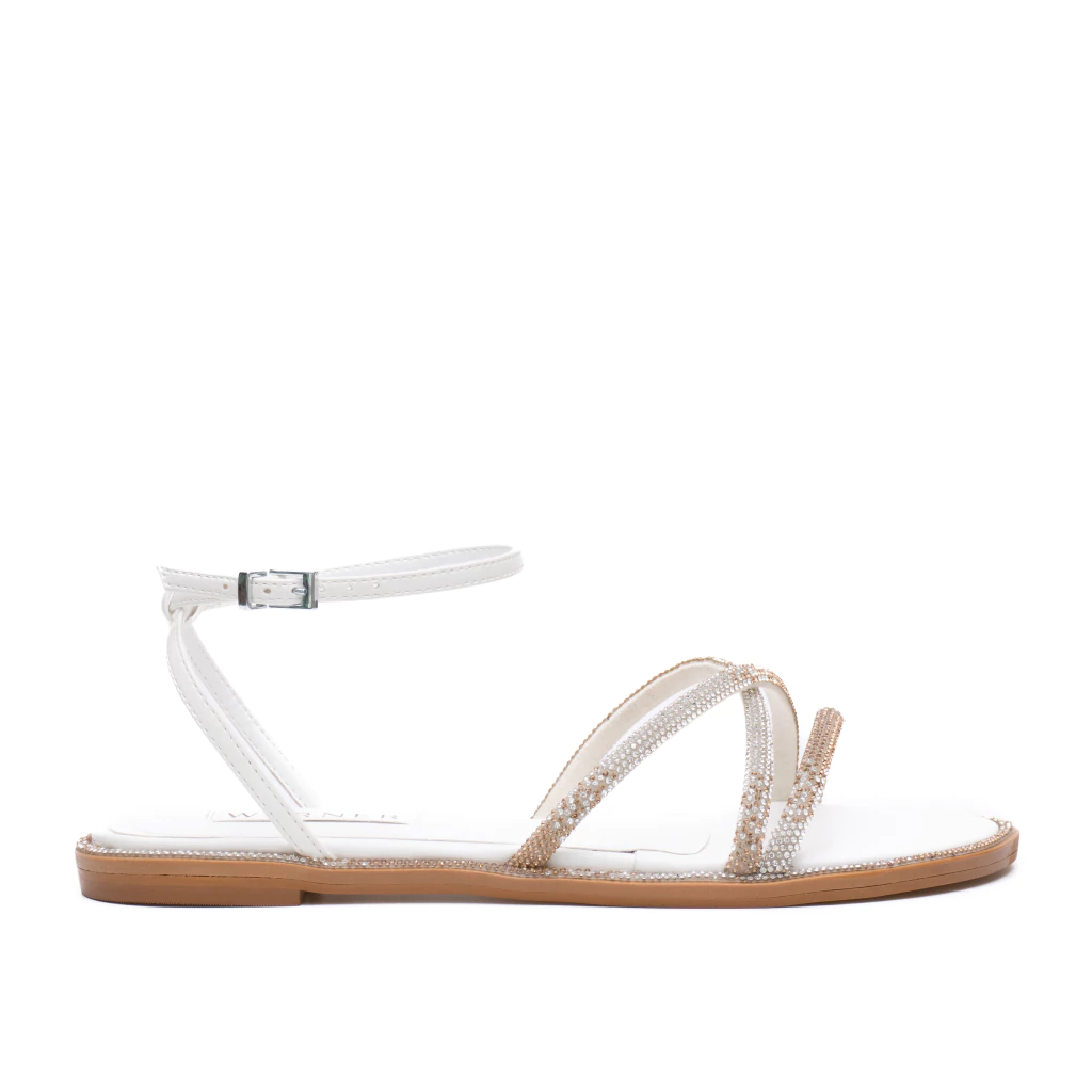A Rasteira Dourada Kate Werner tem salto rasteiro de 1cm e bico redondo. Traz três tiras transversaris de brilho sobre os dedos do pé. Possui traseiro aberto com fechamento de tira fina com fivela lateral.