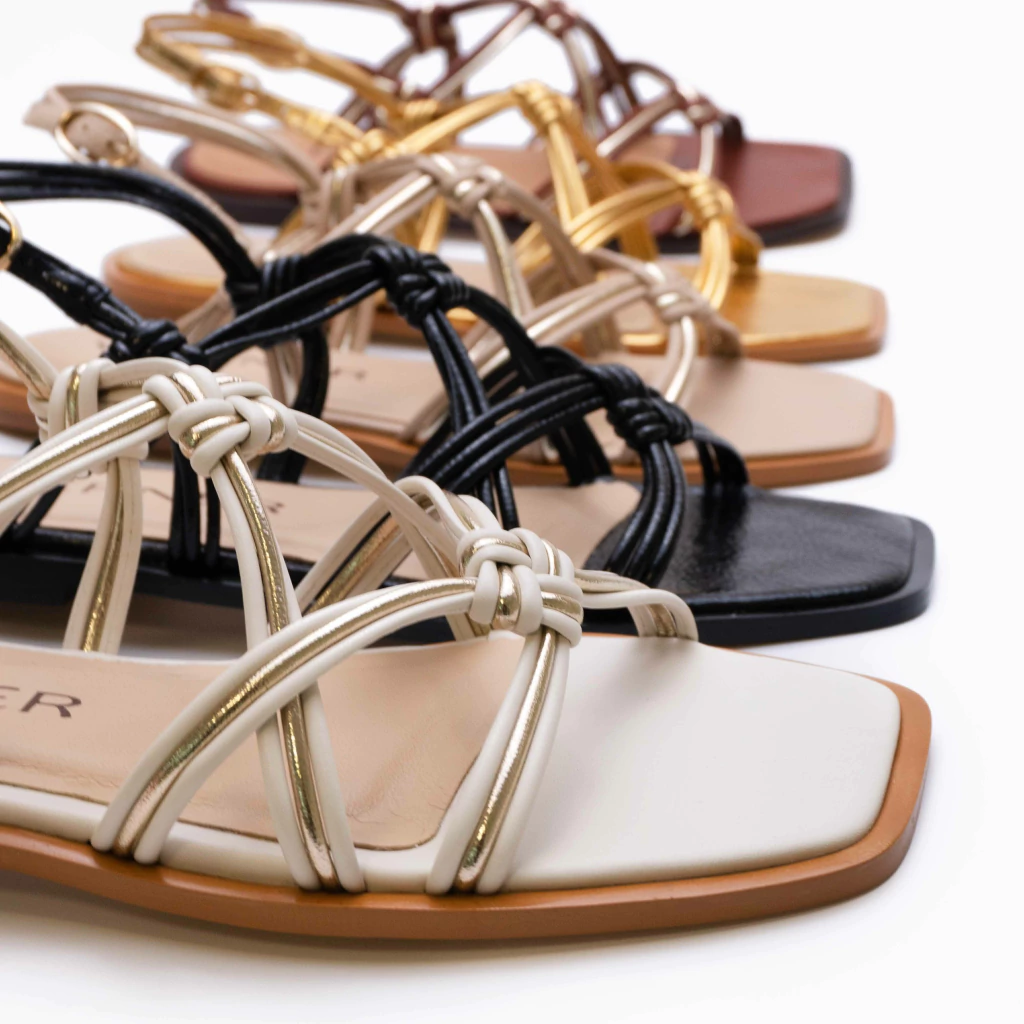 A rasteira Halsey é ideal para mulheres que valorizam conforto sem abrir mão do estilo. O modelo apresenta tiras finas, que se entrelaçam com delicadeza, formando nós discretos que conferem charme artesanal e um visual leve. O ajuste é feito por uma fivela metálica na lateral, que garante praticidade e segurança ao calçar.