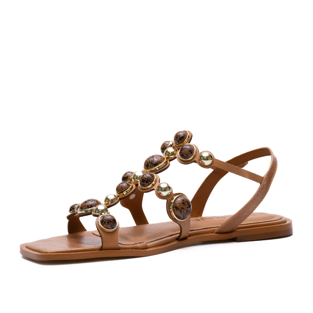 A cor desse modelo é um tom de marrom caramelo em material napa couro com textura suave e toque macio com palmilha em couro. Pedras na cor marrom e dourada.