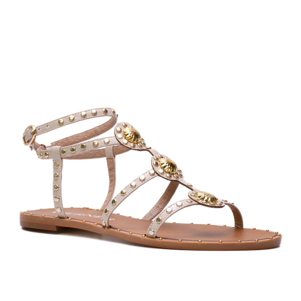 A rasteira Madeline apresenta um design sofisticado e ao mesmo tempo descontraído. O modelo é estruturado por tiras finas, adornadas por pequenas aplicações metálicas que percorrem toda a sua extensão, criando um efeito delicado. Três elementos centrais em relevo, de formato arredondado trabalhados, destacam-se como protagonistas, conferindo personalidade e requinte ao calçado. A tira que envolve o tornozelo conta com uma fivela metálica ajustável, garantindo firmeza e segurança ao caminhar.