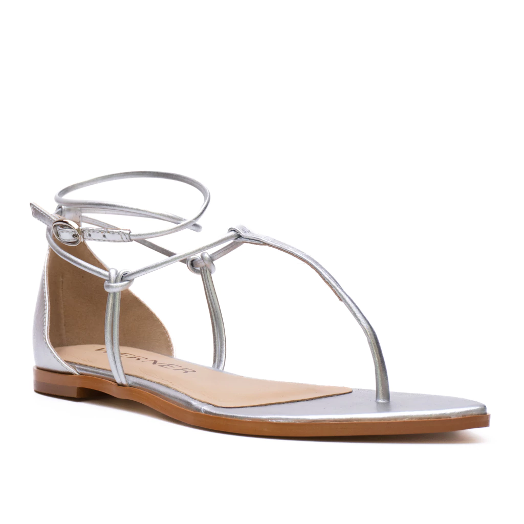 A cor desse modelo é um tom de prata em material napa metalizado couro.