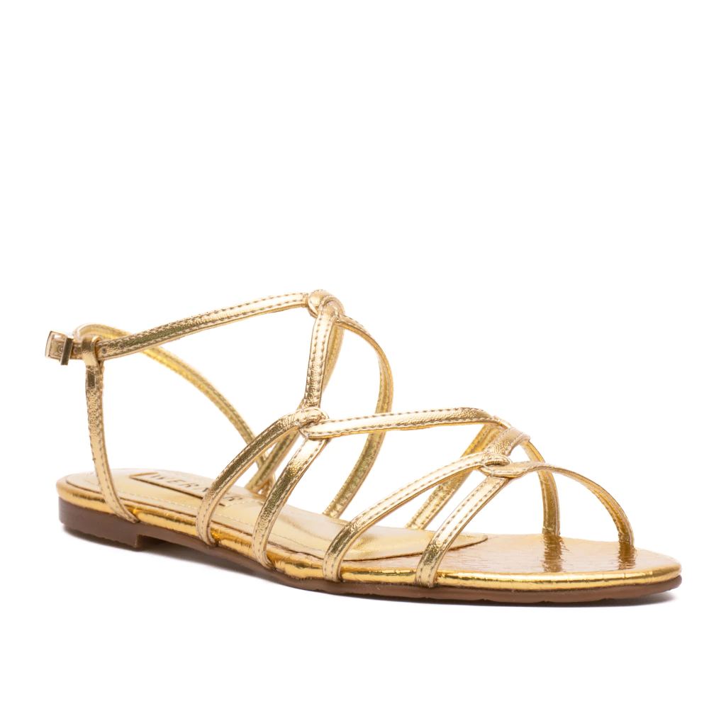 A Rasteira Dourada Emme Werner tem salto rasteiro de 1cm e bico redondo. Traz múltiplas tiras, cobrindo toda a parte do peito do pé. Possui tira fina que fecha em fivela lateral.