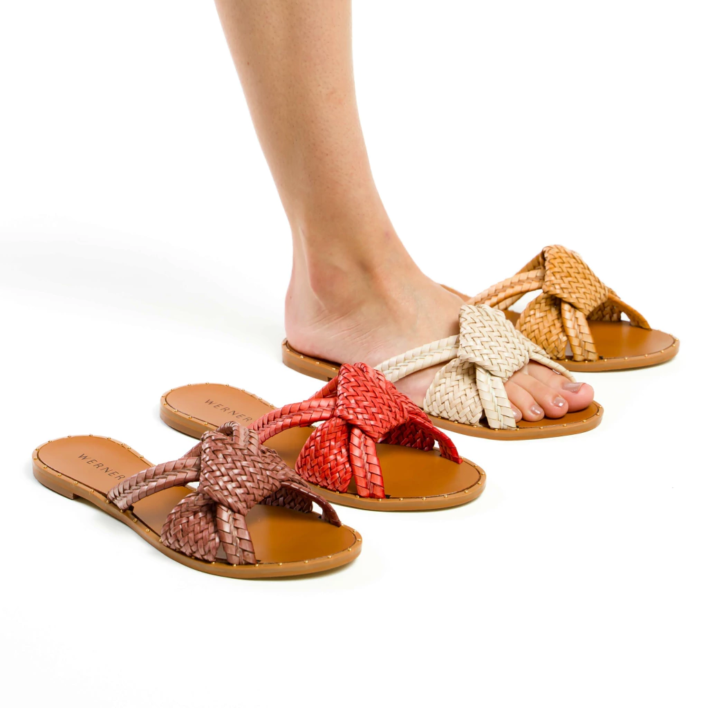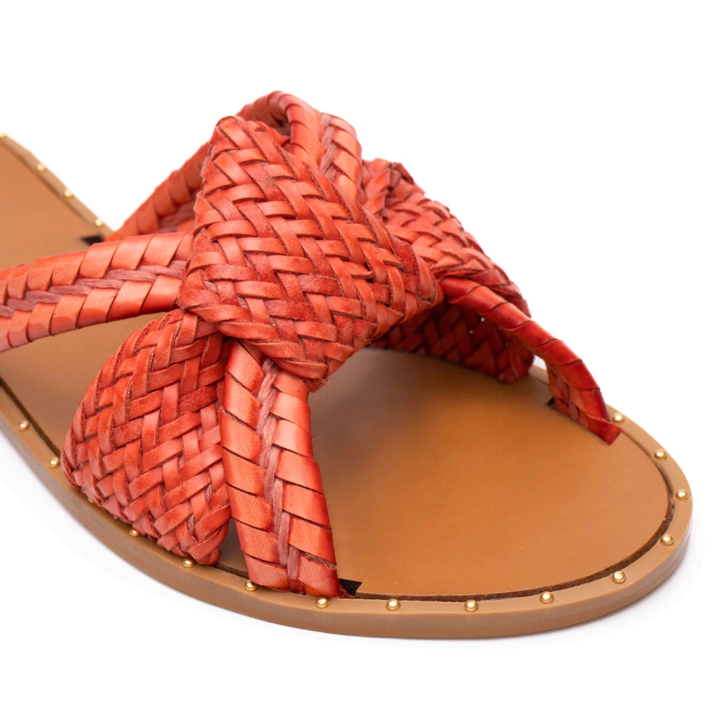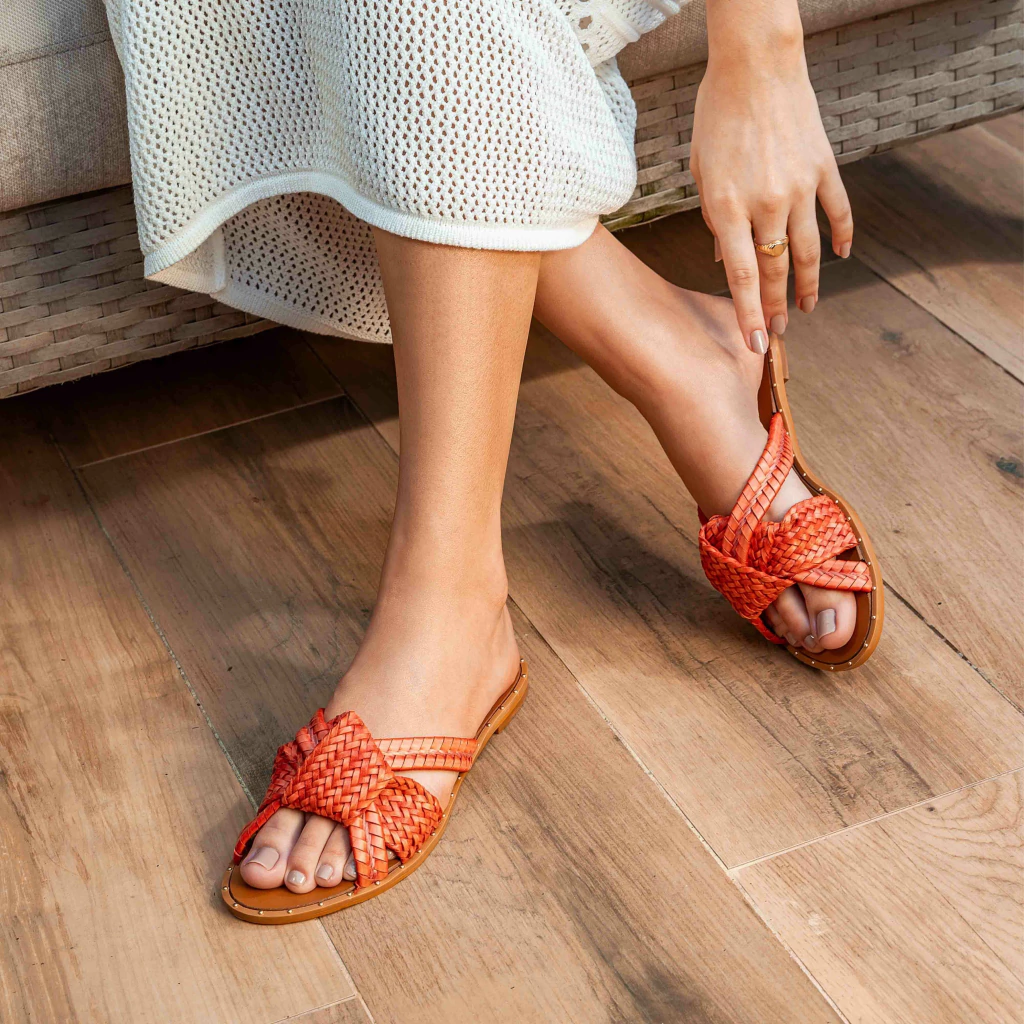A Rasteira Laranja Carmélia Werner tem salto rasteiro de 1cm e bico redondo. Seu cabedal é composto por nó central em material de palha tramada. Apresenta traseiro aberto sem fechamento, super fácil de calçar!