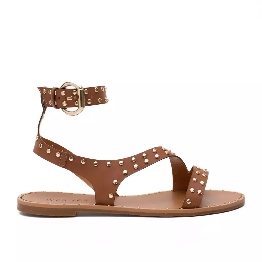 A Rasteira Marrom Amber Werner tem salto rasteiro de 1cm e bico redondo. Seu cabedal é composto por tira sobre os dedos, sobre o peito do pé e no tornozelo. Apresentam aplicações de enfeites metálicos e fechamento por fivela na lateral.