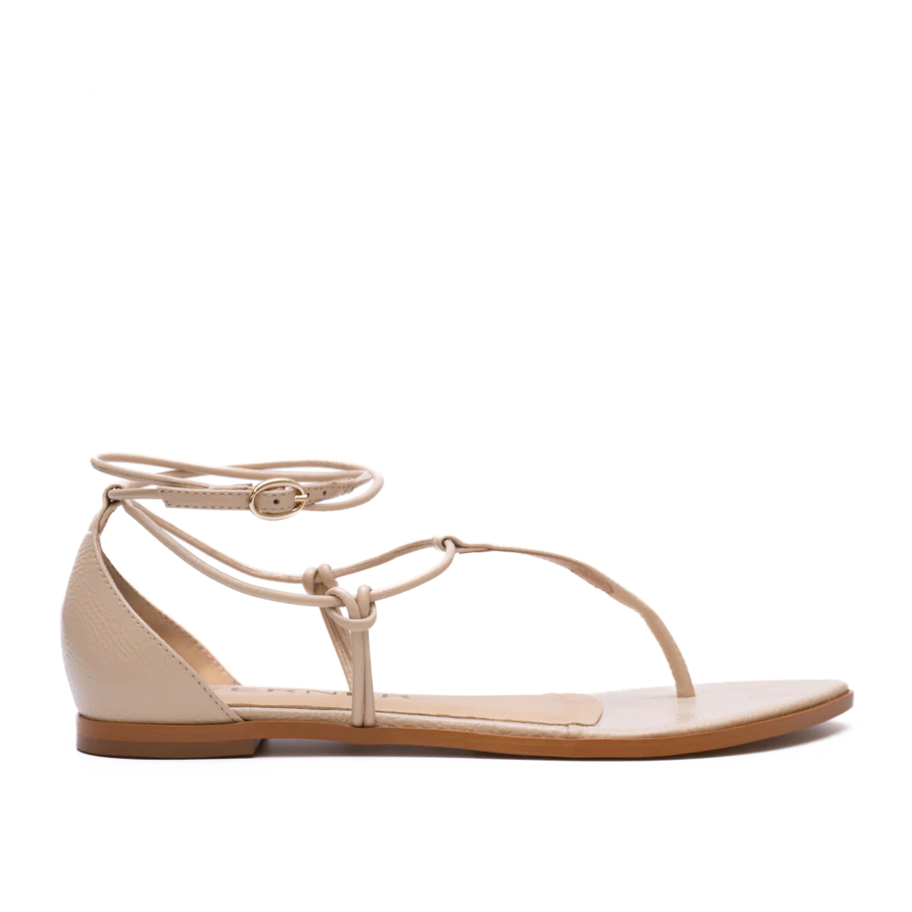 A rasteira Stormi combina simplicidade e elegância em um design versátil e confortável. Sua estrutura é composta por tiras finas e delicadas que se encontram na parte frontal em um detalhe de nó discreto, criando um visual minimalista e sofisticado. O modelo conta com fechamento em fivela metálica ajustável, localizada no tornozelo, que proporciona segurança e praticidade ao calçar enquanto o calcanhar fechado garante maior sustentação.