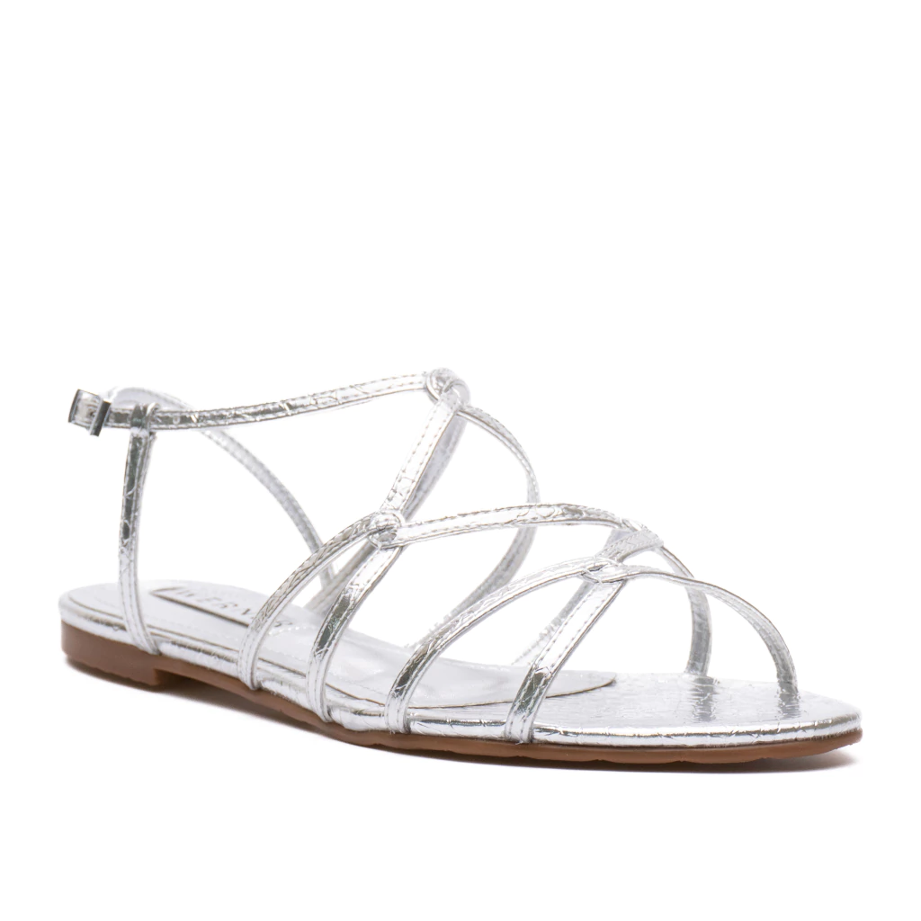 A Rasteira Prata Emme Werner tem salto rasteiro de 1cm e bico redondo. Traz múltiplas tiras, cobrindo toda a parte do peito do pé. Possui tira fina que fecha em fivela lateral.