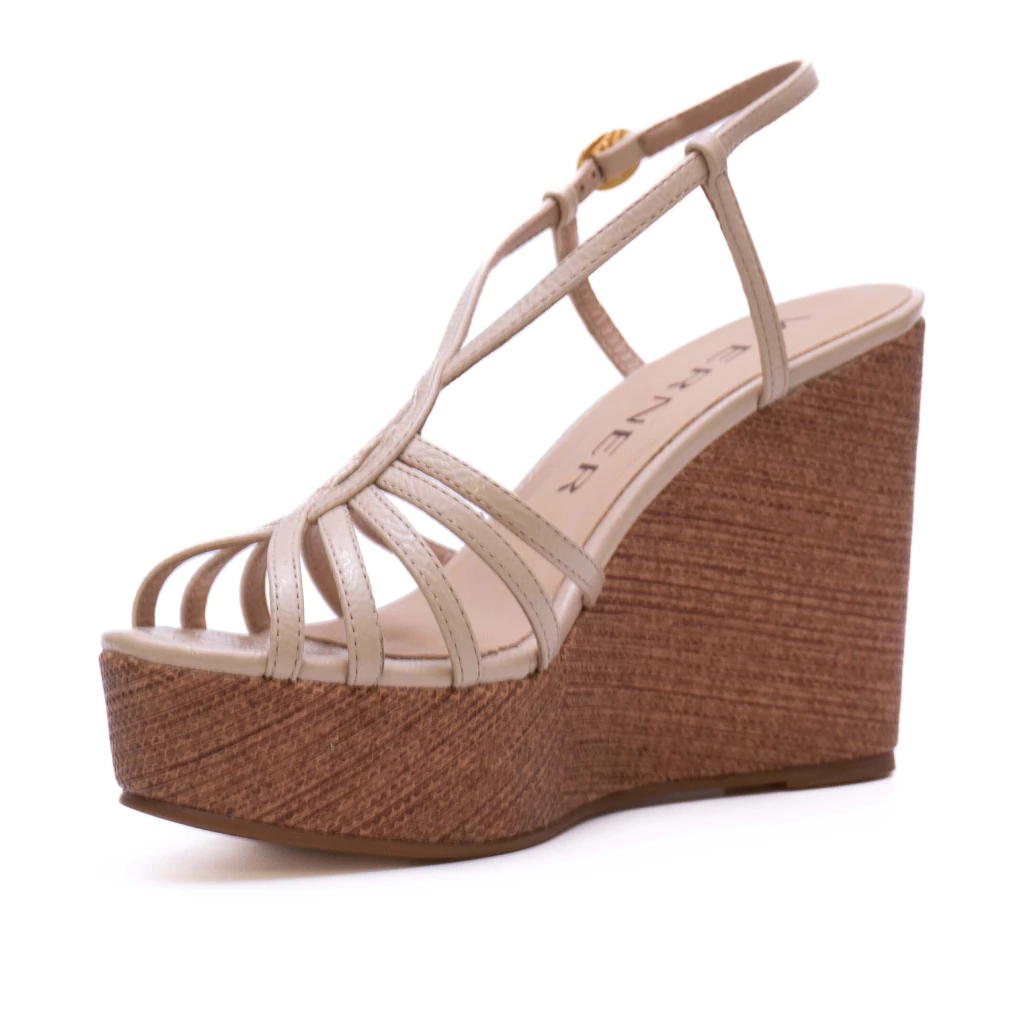 A sandália Anahi apresenta um design elegante com salto anabela de altura de 10cm. A parte superior é composta por delicadas tiras finas que se cruzam na região frontal, criando um visual sofisticado e ao mesmo tempo leve, deixando os pés parcialmente à mostra. O fechamento é feito por meio de uma tira fina ajustável que contorna o tornozelo, presa por uma pequena fivela, garantindo segurança e firmeza ao caminhar. O contraste entre a estrutura robusta do salto e a delicadeza das tiras superiores resulta em um modelo versátil.