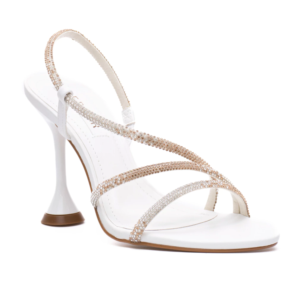 A Sandália Branca Kate Werner tem salto alto arquitetônico na altura de 10cm e bico redondo. Seu cabedal é composto por três tiras de brilho que contorno todo o pé. Apresenta fechamento no pé com encaixe de elástico.