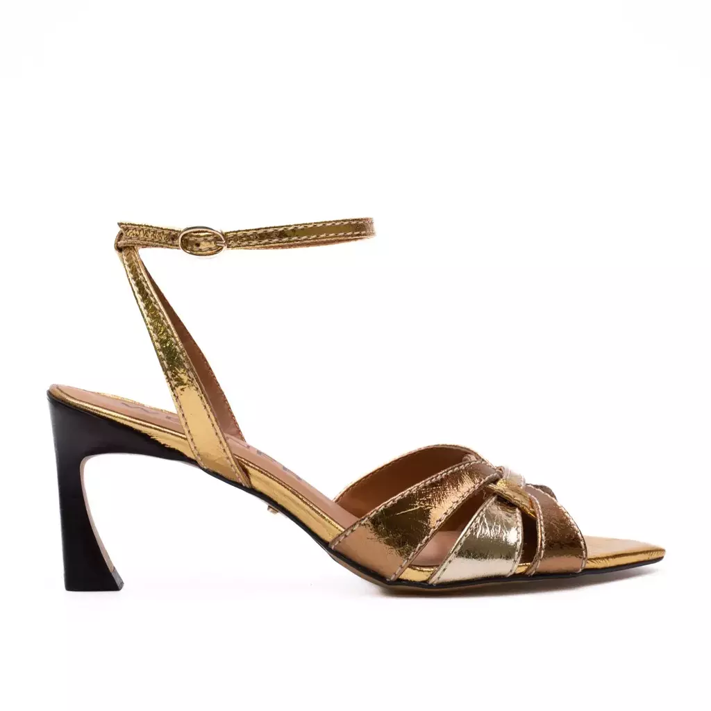 A cor desse modelo é um tom de bronze, ouro e champagne em material metalizado texturizado couro com palmilha em couro.