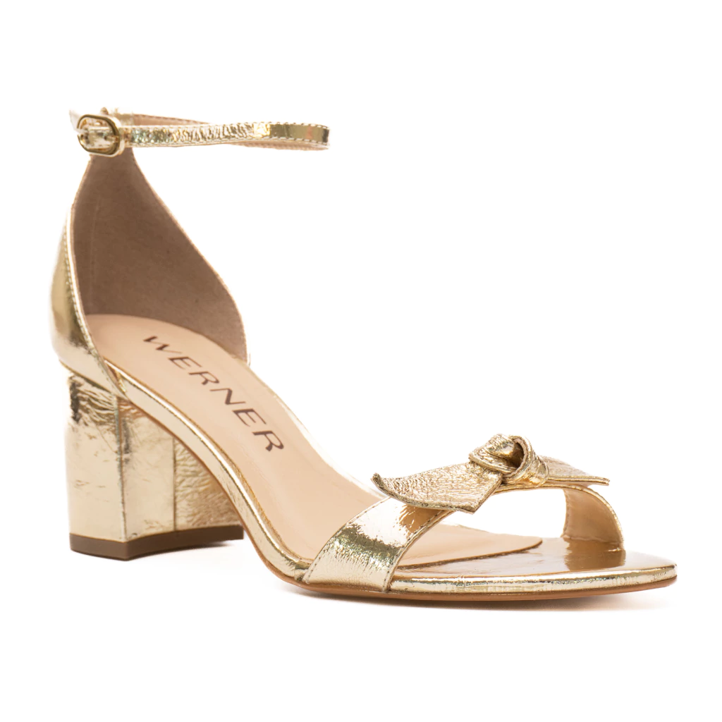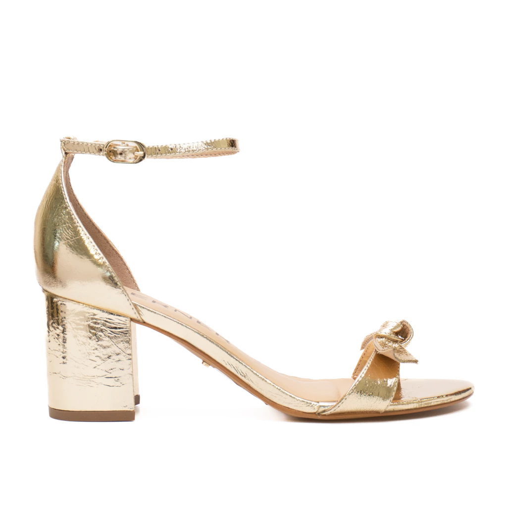A cor desse modelo é um tom de dourado em material metalizado texturizado couro.