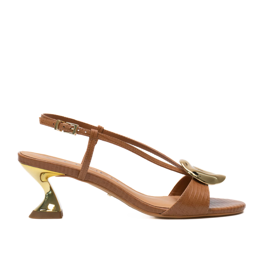 A sandália Noelma é a definição de elegância moderna. Com salto escultural de 5cm em acabamento metálico, o modelo adiciona um toque contemporâneo ao visual sem abrir mão do conforto. Suas tiras delicadas valorizam o pé com leveza, enquanto a aplicação do enfeite metálico orgânico no cabedal traz um charme extra ao design minimalista. O fechamento com fivela garante ajuste seguro e praticidade no dia a dia.