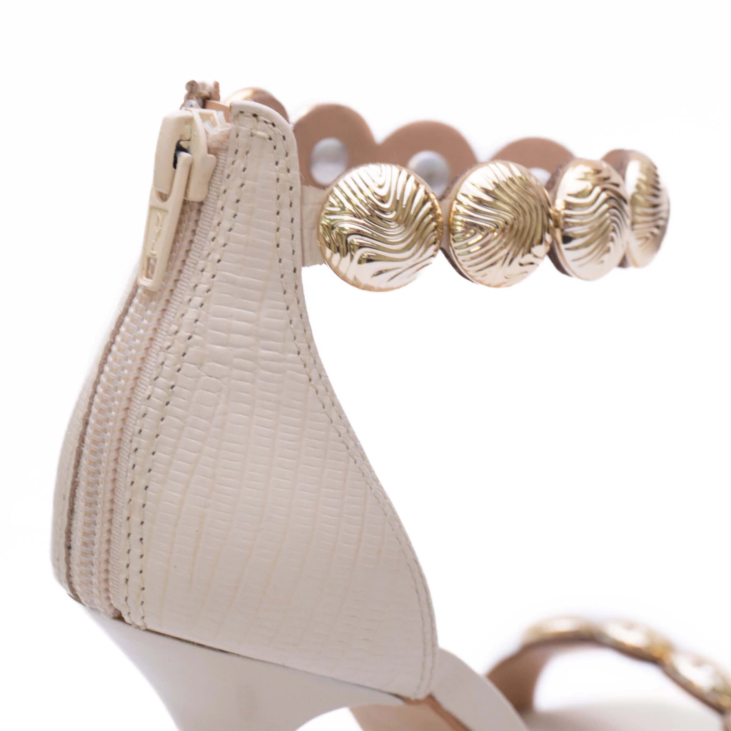 A sandália Alana apresenta um design sofisticado e moderno, ideal para ocasiões especiais. O salto fino na altura de 10cm alonga a silhueta, proporcionando um visual refinado. As tiras que envolvem o pé são adornadas com aplicações circulares em relevo, com textura de inspiração orgânica semelhante a folhas ou padrões naturais, criando um efeito tridimensional marcante. O fecho localizado na parte traseira assegura firmeza e conforto ao caminhar.