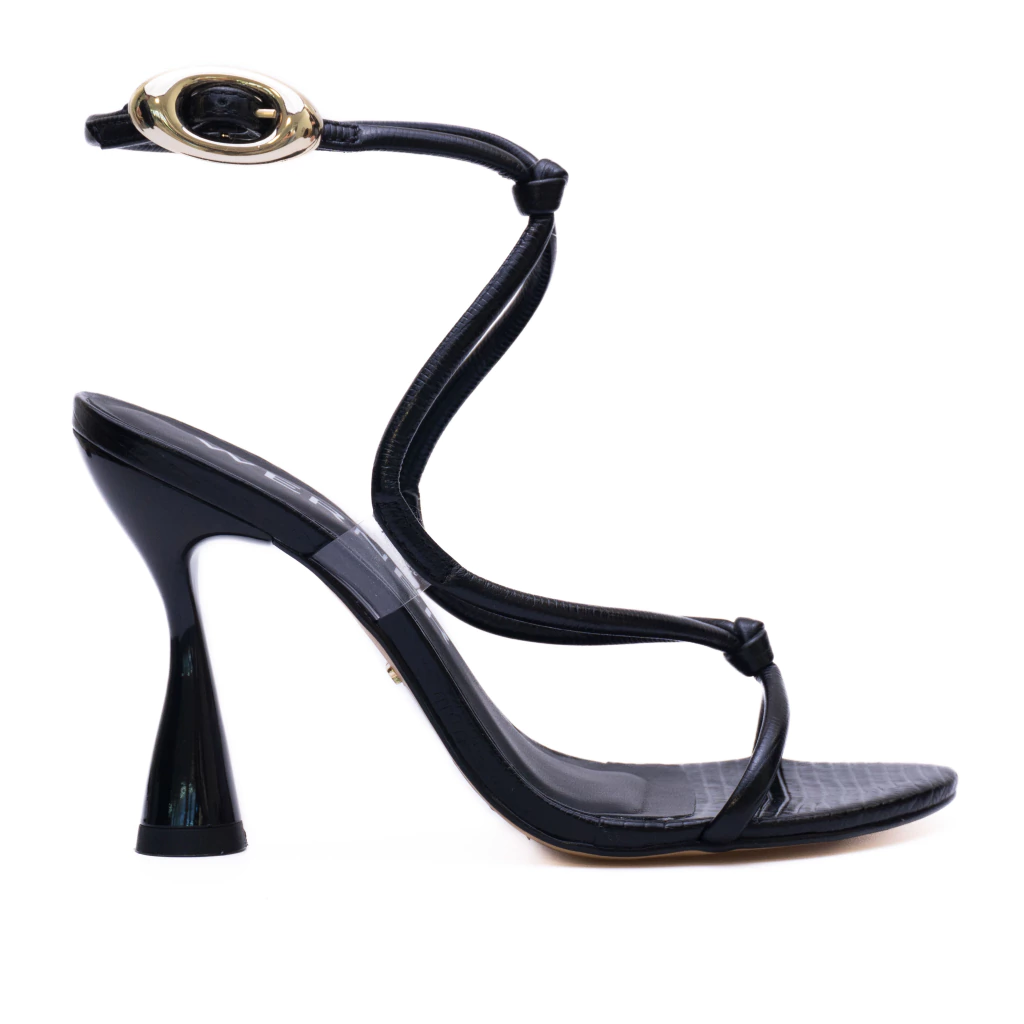 A sandália Fadia apresenta um design minimalista e contemporâneo, com estrutura delicada composta por tiras finas e elegantes. O modelo conta com um salto na altura de 10cm, conferindo um visual moderno, oferecendo maior estabilidade ao caminhar. A tira frontal possui uma amarração discreta em nó, que adiciona um toque artesanal e charmoso ao calçado. O ajuste ao tornozelo é feito por uma tira fina com fivela metálica oval, que se destaca pelo seu detalhe sofisticado.