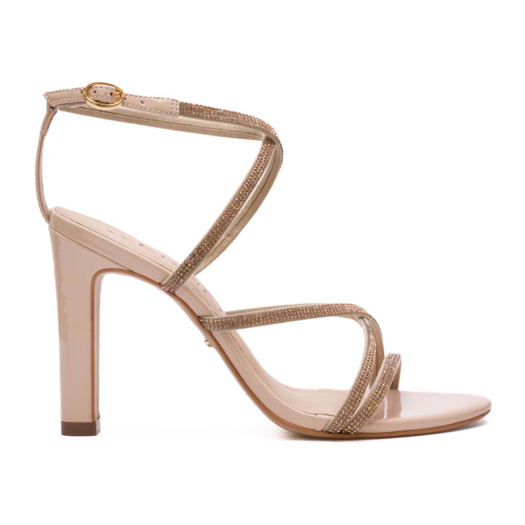 A sandália Estela apresenta um design sofisticado e contemporâneo, ideal para ocasiões especiais. A estrutura conta com várias tiras finas delicadamente cravejadas com pequenas aplicações brilhantes que conferem um visual requintado e cheio de glamour. As tiras entrelaçam-se de forma sobre o peito do pé, criando um efeito visual moderno e leve. O fecho com fivela ajustável na zona do tornozelo proporciona segurança e estabilidade. O salto alto na altura de 10cm, alonga a silhueta e confere imponência ao visual.