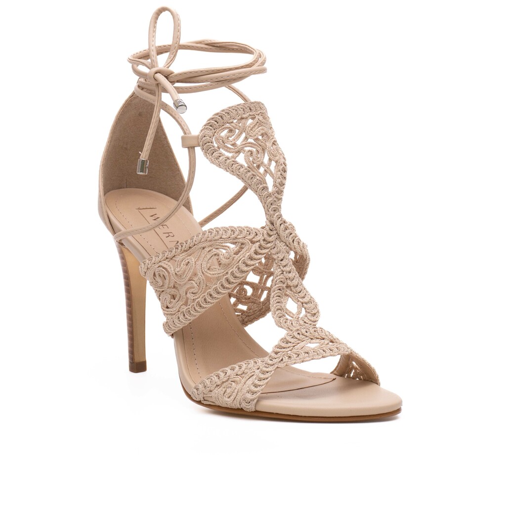 A Sandália Nude Rachel Werner tem salto alto fino na altura de 10cm e bico redondo. Traz cabedal vazado em tecido natural trançado. Fechando atrás, tem fechamento com amarração.