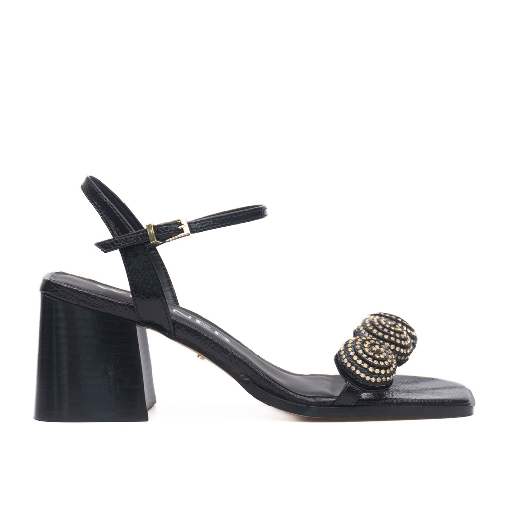 A cor desse modelo é um tom de preto em material verniz texturizado e palmilha em couro.