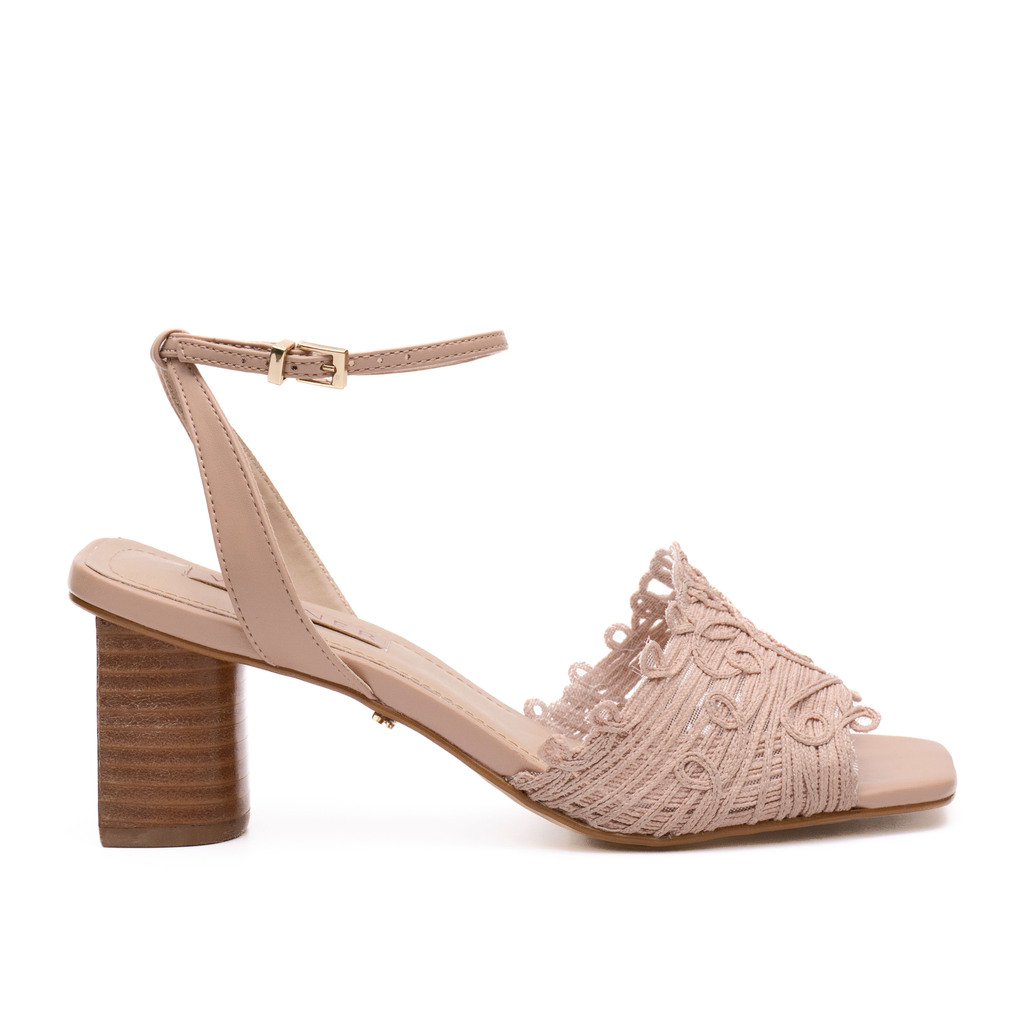 A Sandália Rosa Queimado Grace Werner tem salto médio grosso na altura de 6,5cm. Com bico levemente quadrado, tem cabedal de tira larga sobre os dedos de tecido natural trançado. Apresetna tira fina que sai das laterais, se cruza no calcanhar, contorna o tornozelo e fecha em fivela lateral.