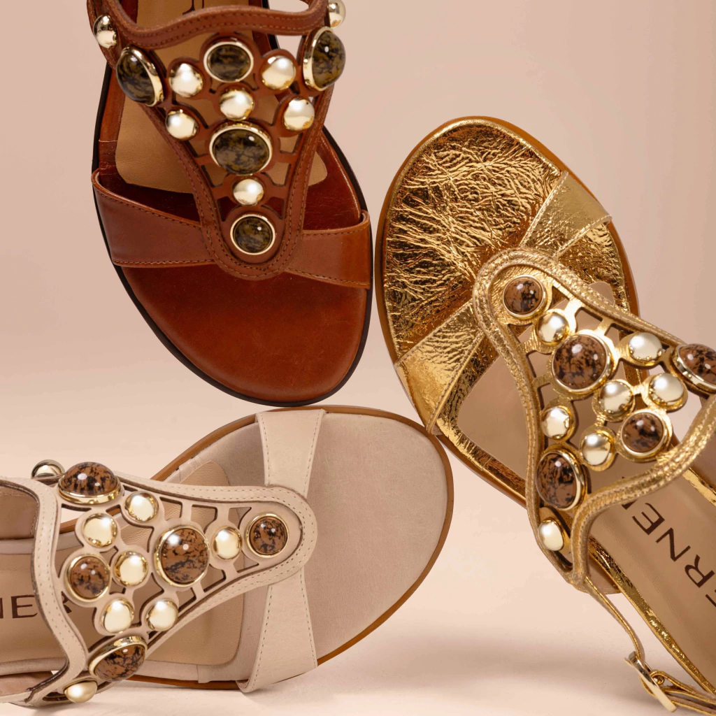 A cor desse modelo é um tom de off white em material napa couro com textura suave e toque macio com palmilha em couro. Pedras na cor marrom e dourada.