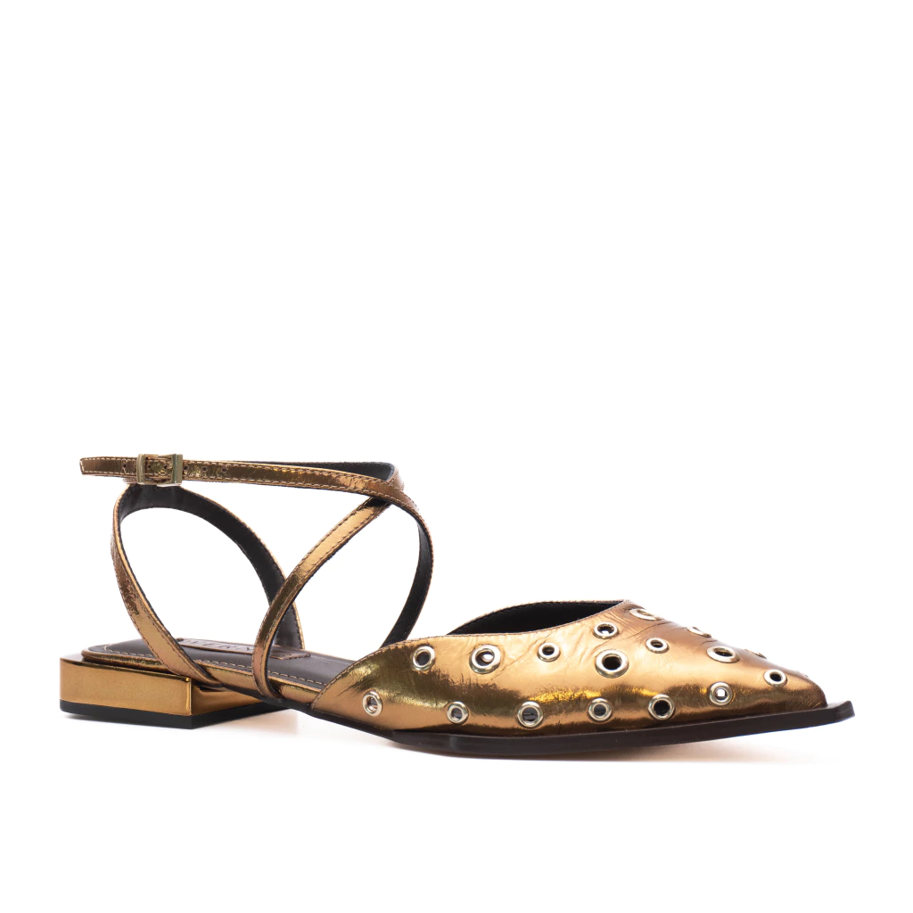 A sapatilha Pietra possui design moderno e detalhes em ilhós no cabedal, trazendo um toque de estilo e personalidade. O modelo apresenta bico fino, conferindo elegância e delicadeza ao visual, além de tiras finas que contornam o tornozelo, garantindo ajuste perfeito e um charme extra. Com fechamento por fivela lateral e solado baixo, proporciona conforto e praticidade para o dia a dia.