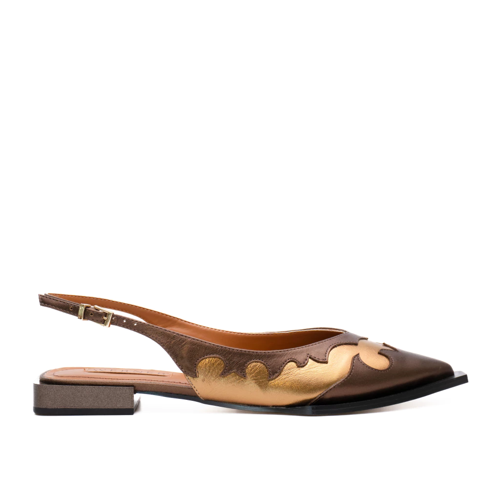 A cor desse modelo é um tom de marrom e bronze em material napa metalizado couro.