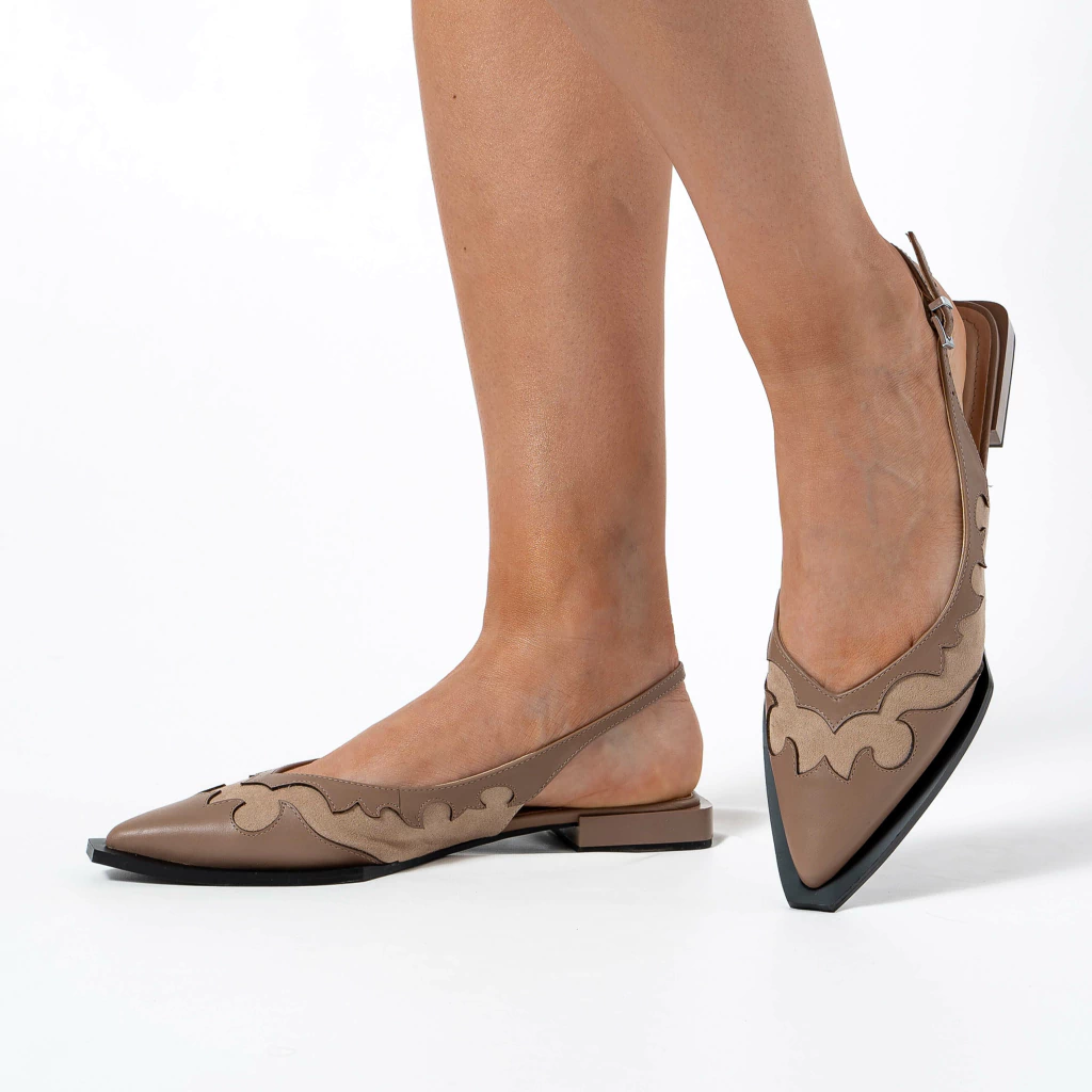 A cor desse modelo é um tom de marrom acizentado em material napa liso couro e camurça textil nude.