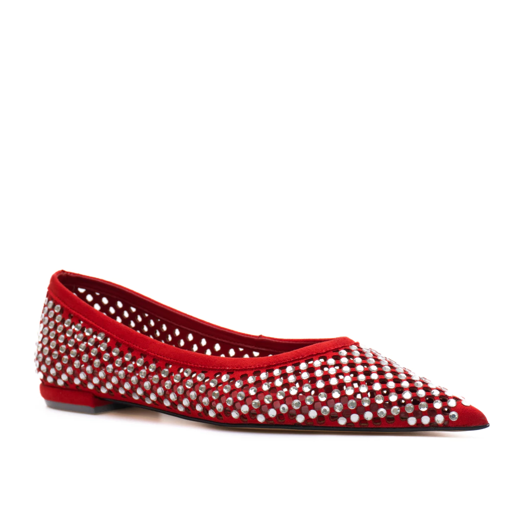 A cor desse modelo é um tom de vermelho no material camurça revisto em cristais.