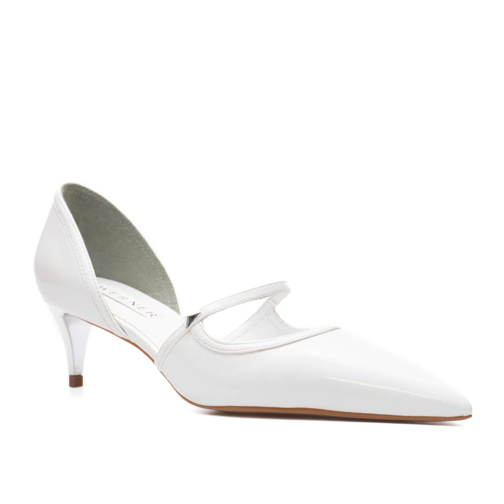 A cor desse modelo é um tom de branco em material verniz levemente texturizado couro