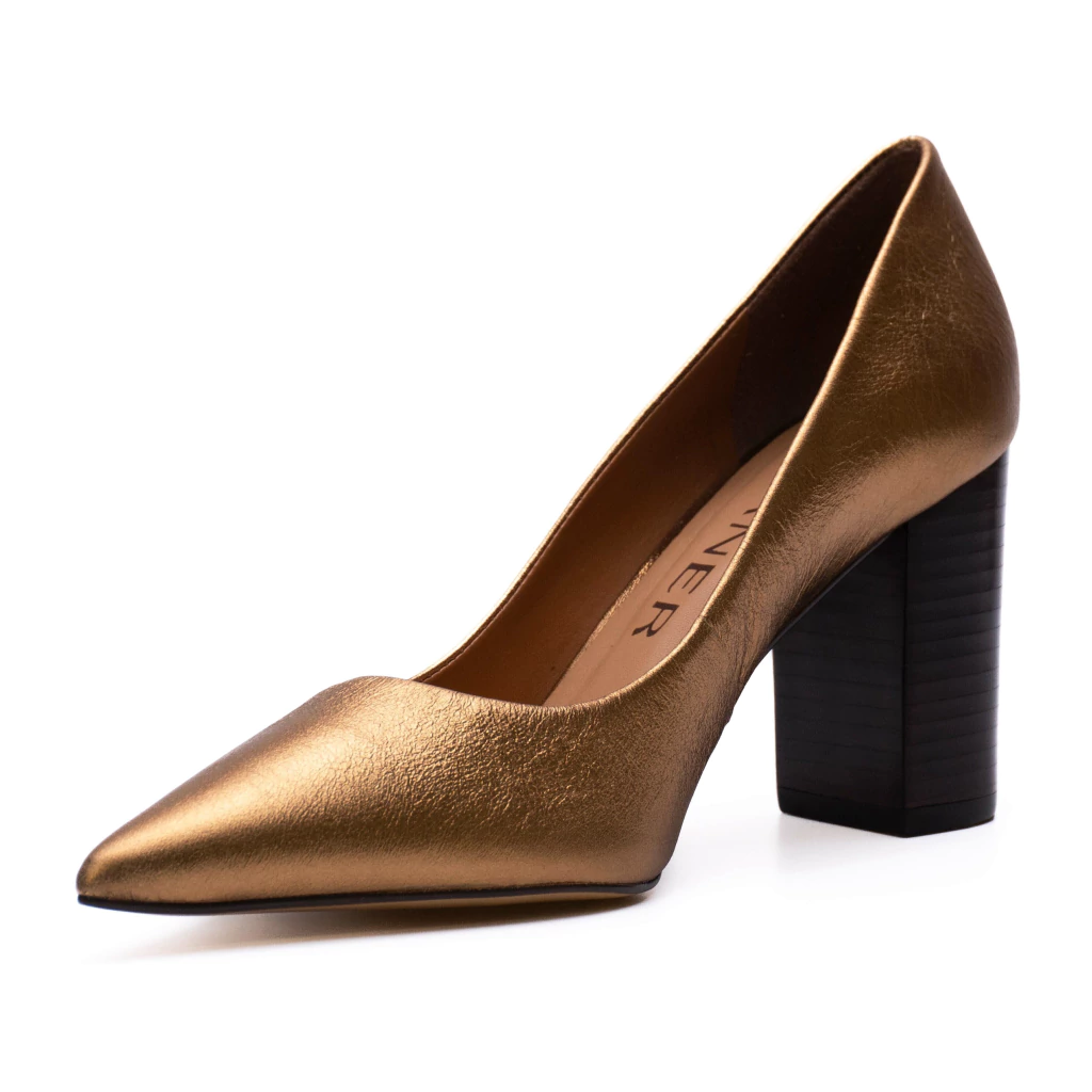 A cor desse modelo é um tom de bronze em material metalizado couro com palmilha em couro.