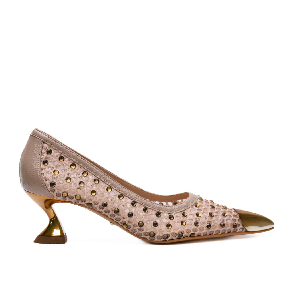 O modelo apresenta uma base em malha crochê nude com pequenos cristais brilhantes e verniz texturizado nude.