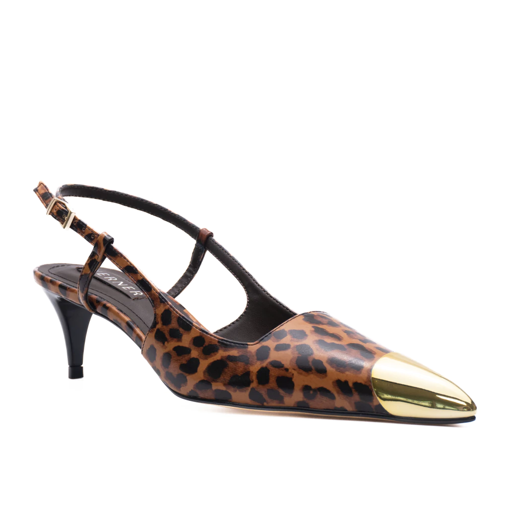 A cor desse modelo e uma estampa de animal print onca (napa sintetico liso) com salto preto e biqueira dourada.